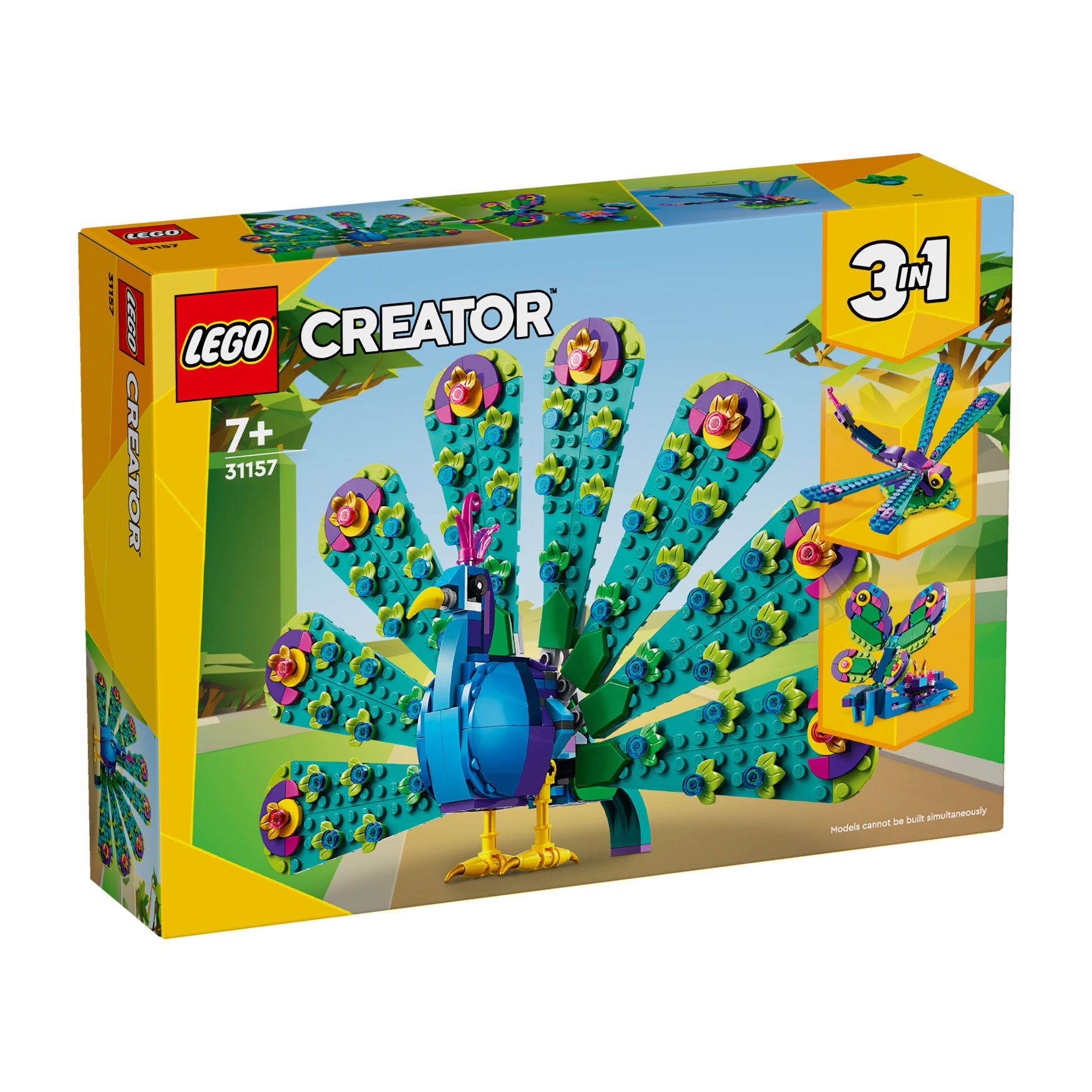 Boys and girls aged 7+ can build, play with and display 3 different exotic LEGO® animal toys with this impressive Creator Exotic Peacock (31157) 3in1 building set. It features a peacock toy with a set of beautiful and detailed tail feathers that can be folded down or proudly spread out.