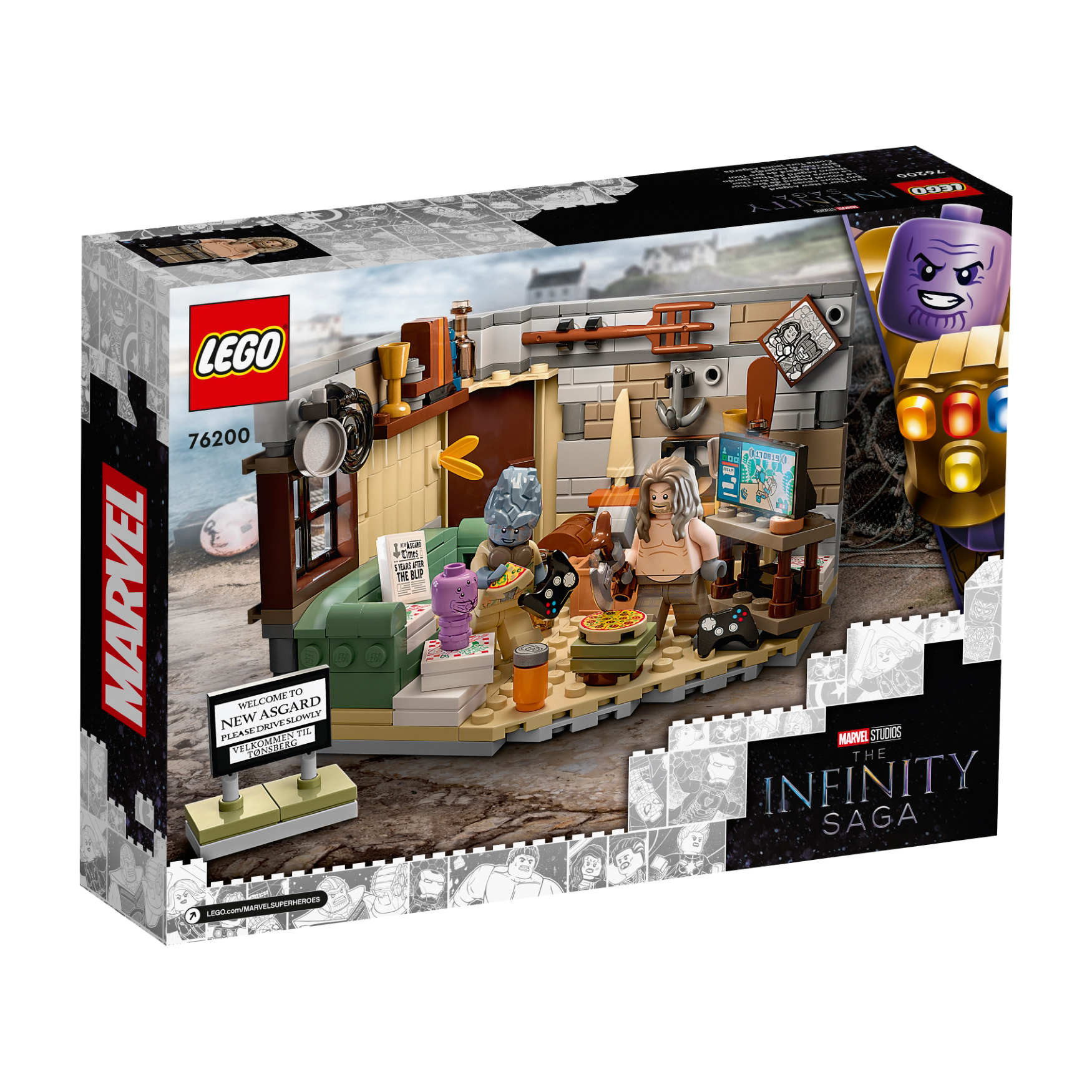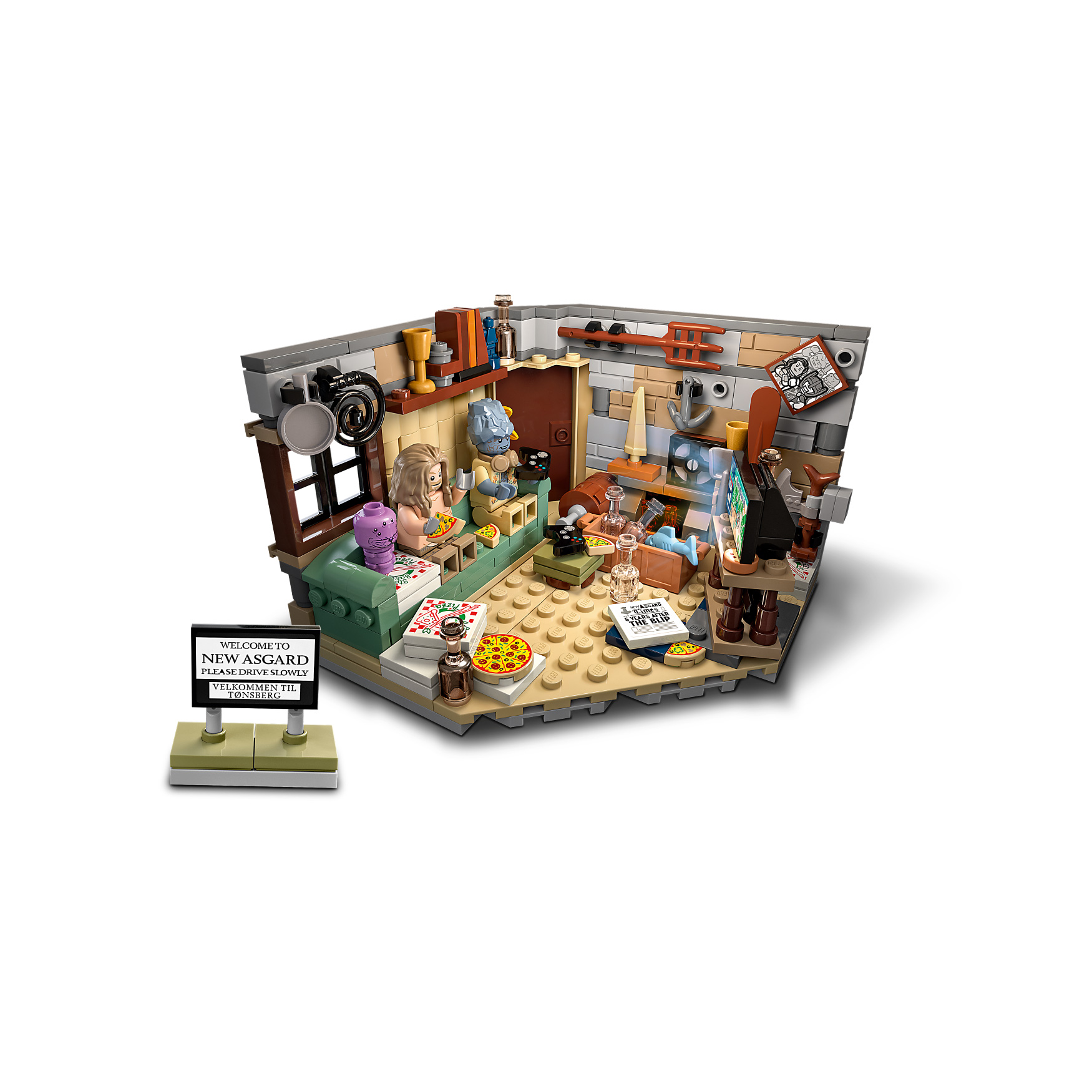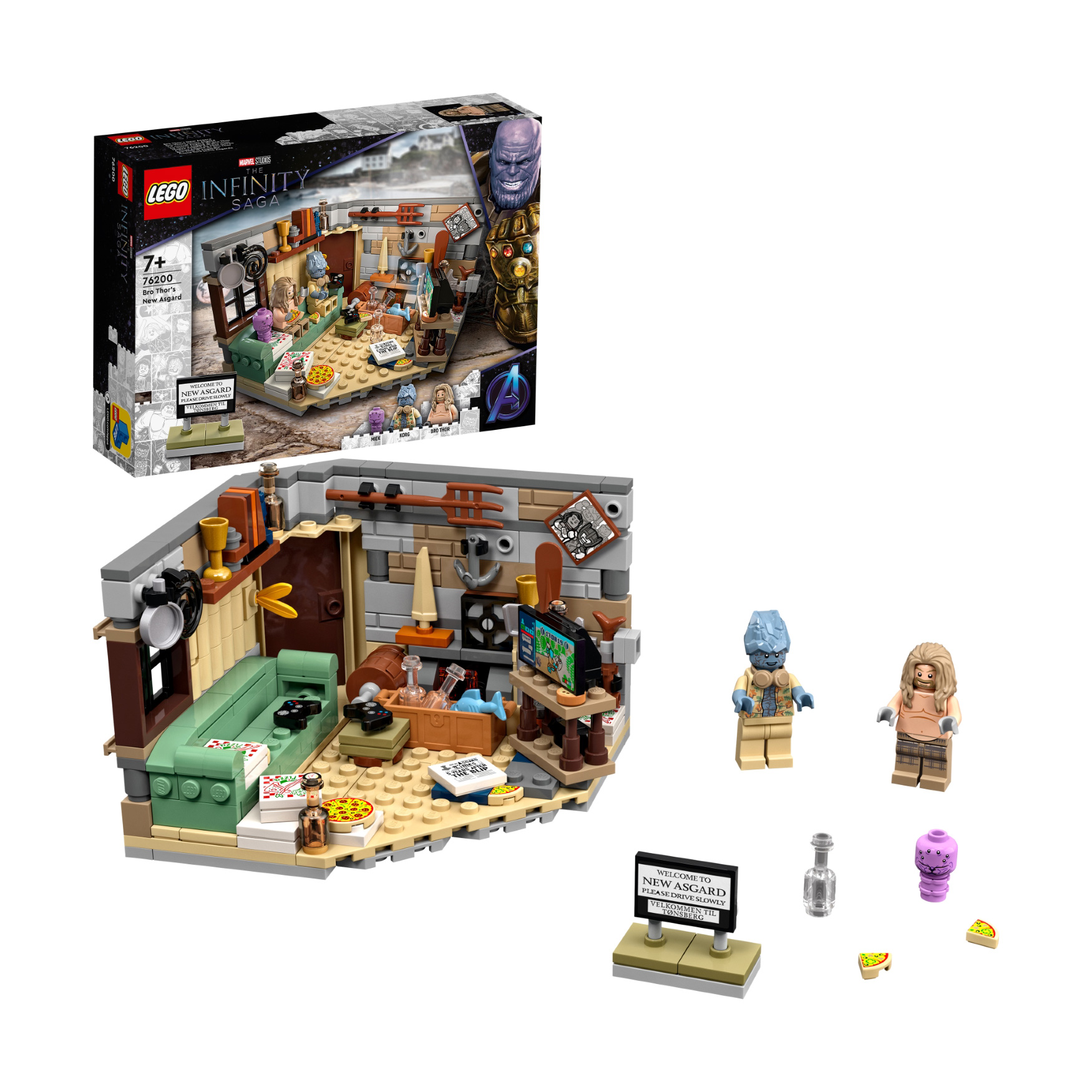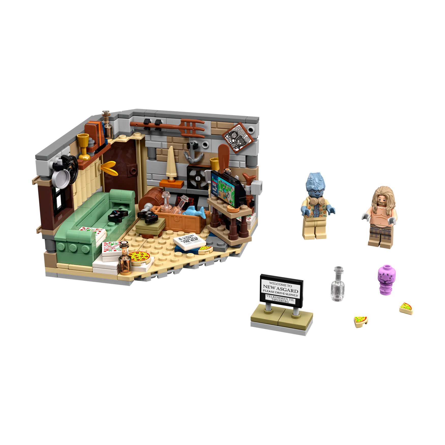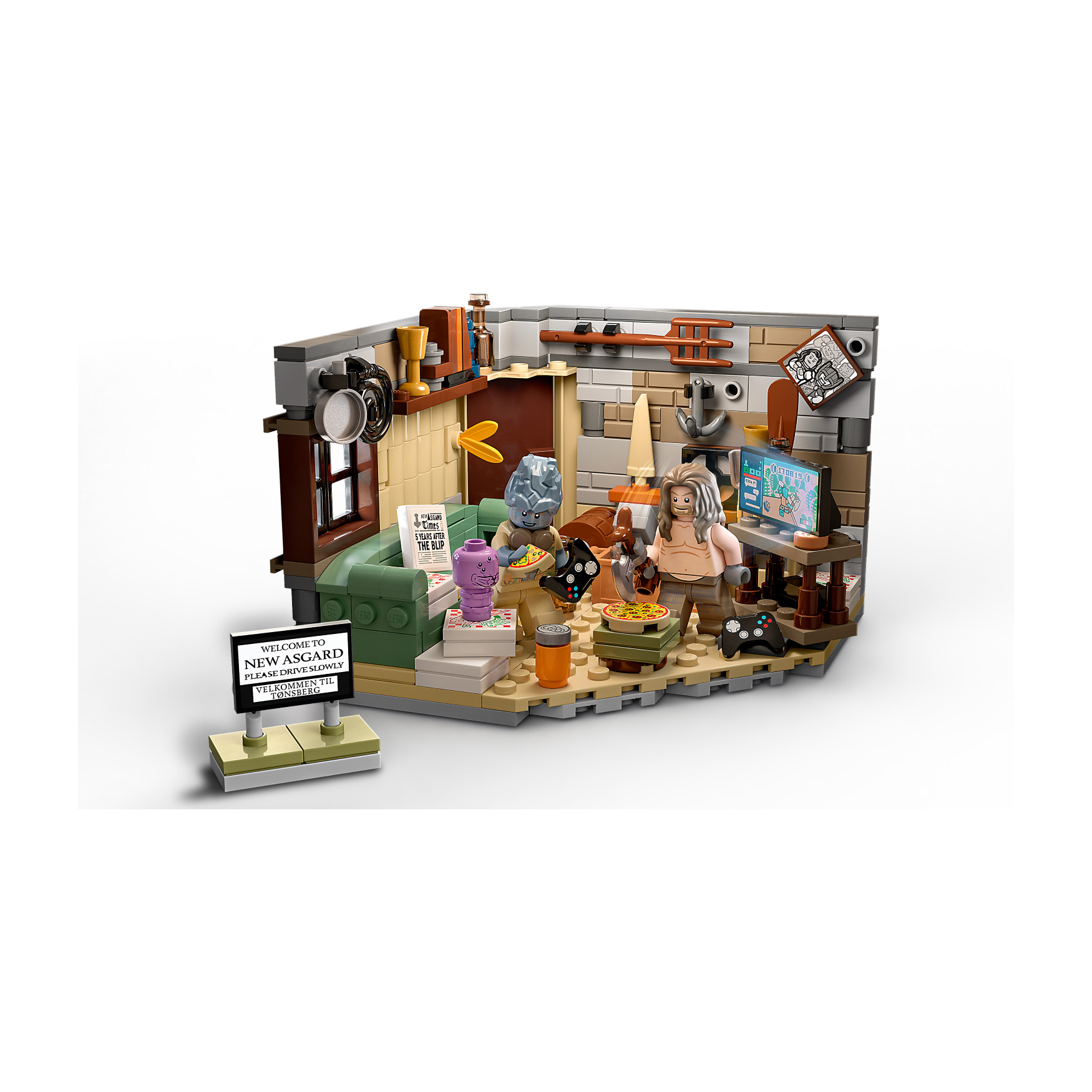 Recreate Thor’s fantastic new Asgard from the movie “Avengers: Endgame” and create exciting superhero action scenes with Bro Thor, Korg and Miek. In Thor’s cool room you can discover many exciting things. The Stormbreaker axe, a game console, a couch, a TV screen and pizza boxes provide Entertainment for Thor between duels.
