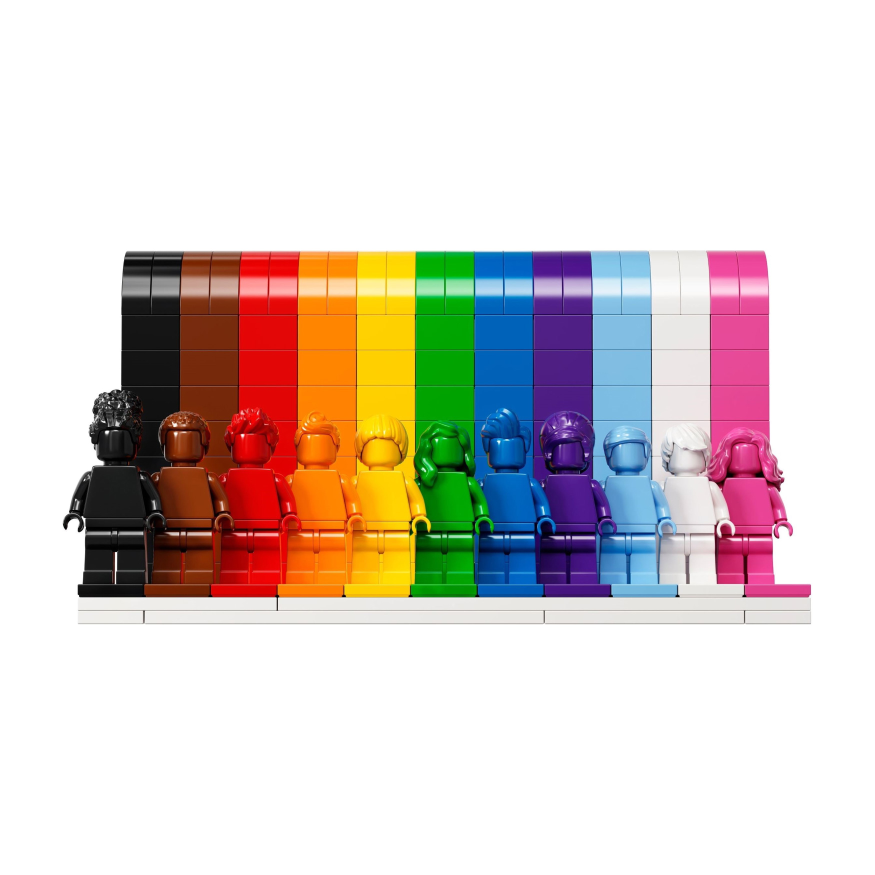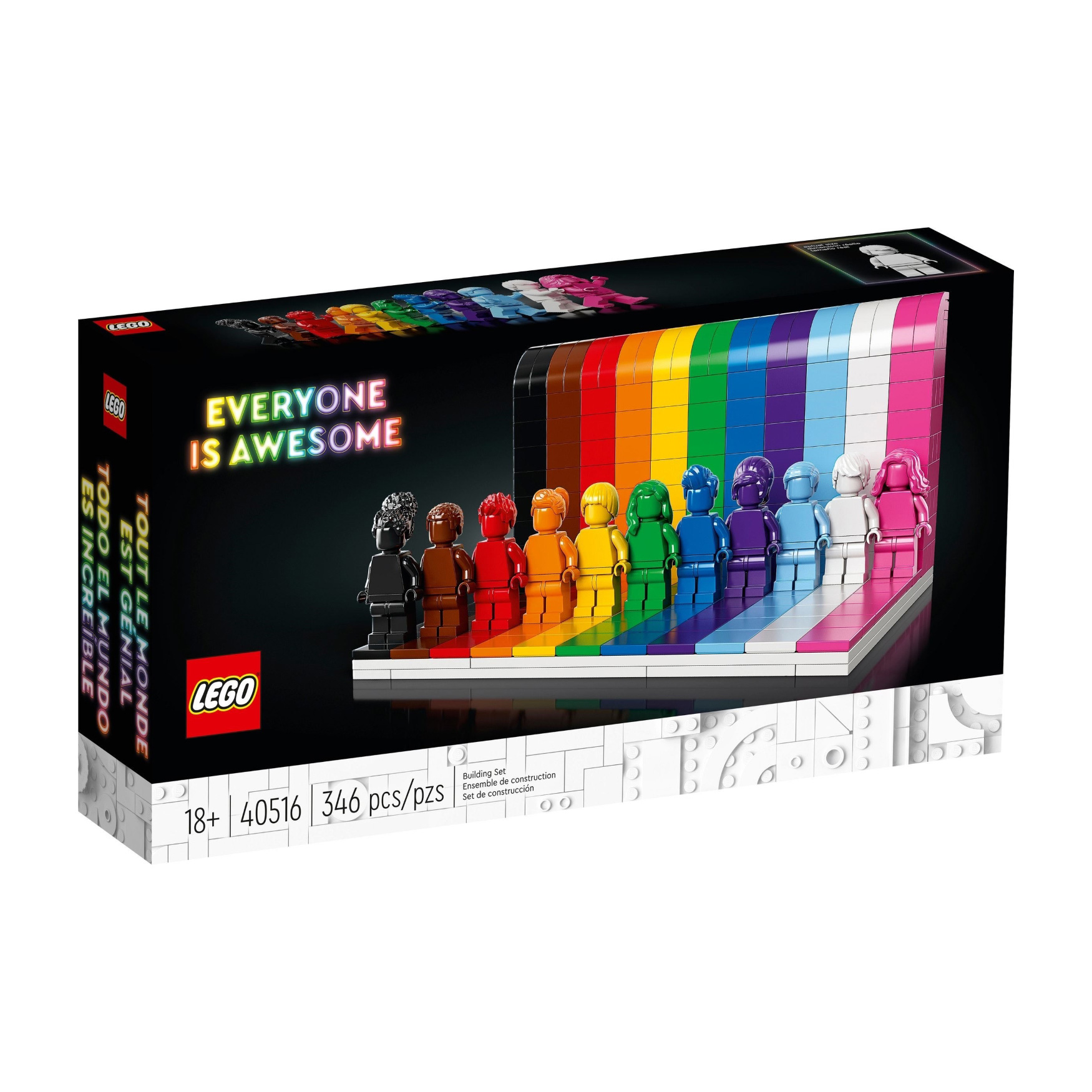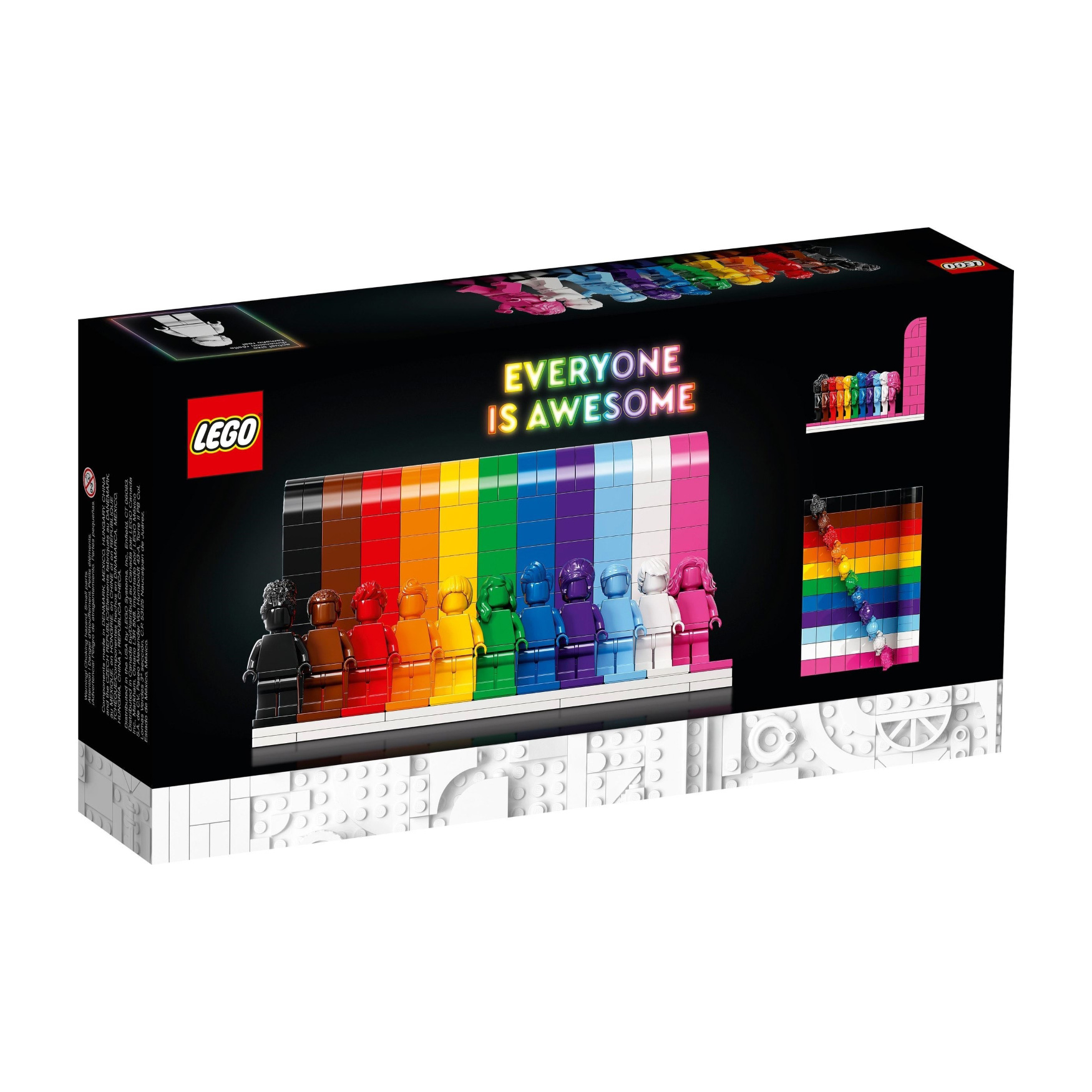 Build your very own homage to positivity and kindness with the LEGO® Everyone is Awesome building set. 11 monochrome minifigures stand against a rainbow background. Each minifigure not only has a different color, but also an individual hairstyle to represent the diversity of our community. Put out your model and show the world that despite all the differences, we celebrate love and togetherness together.