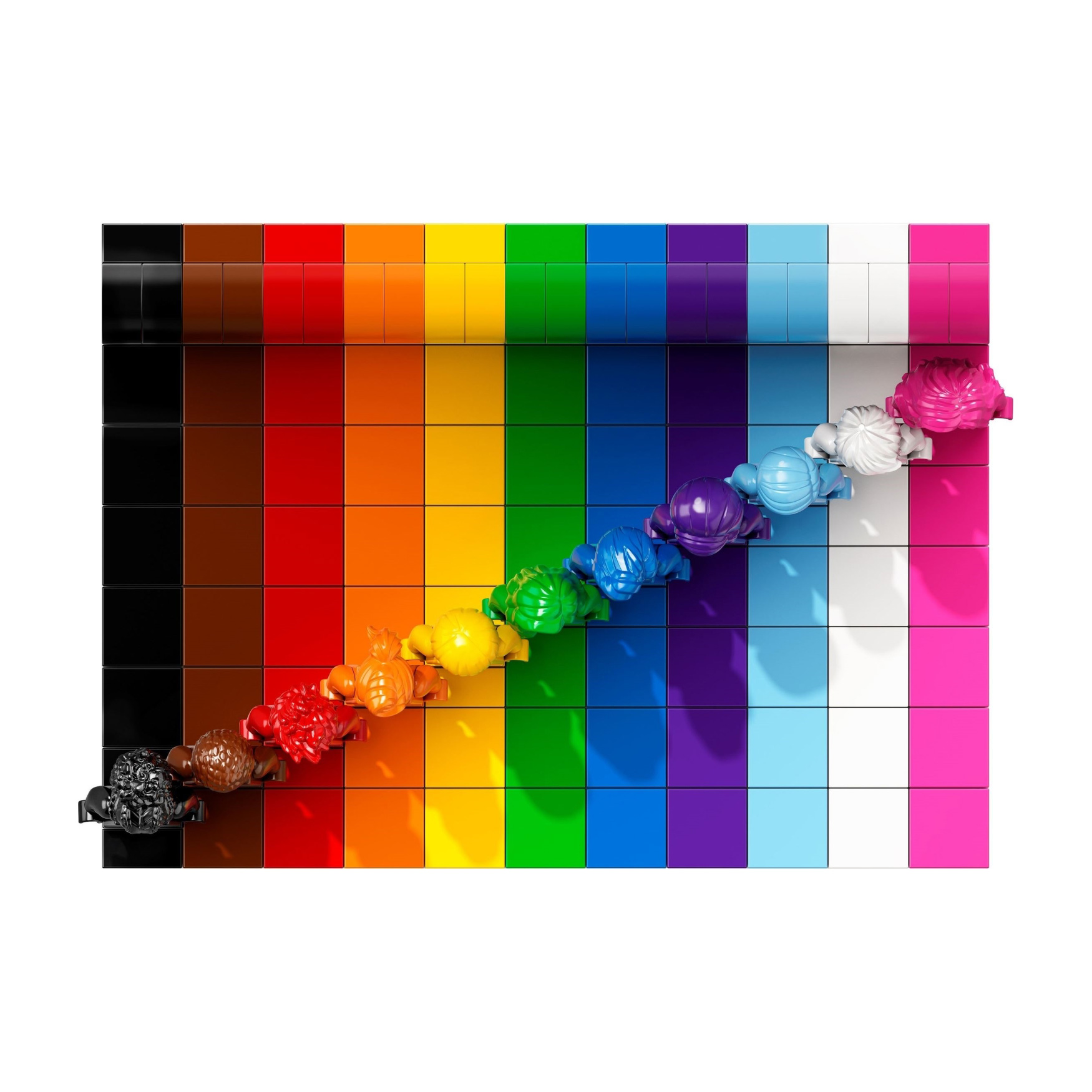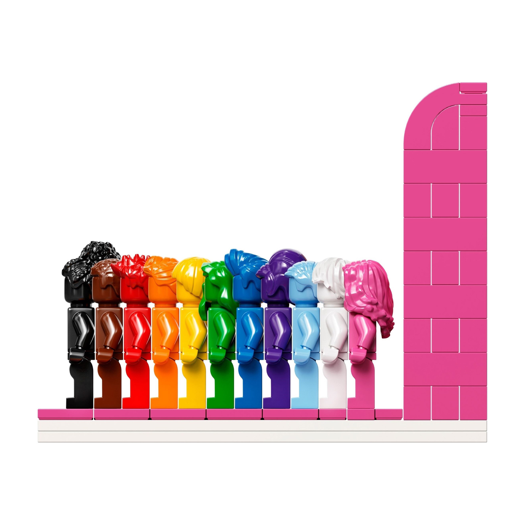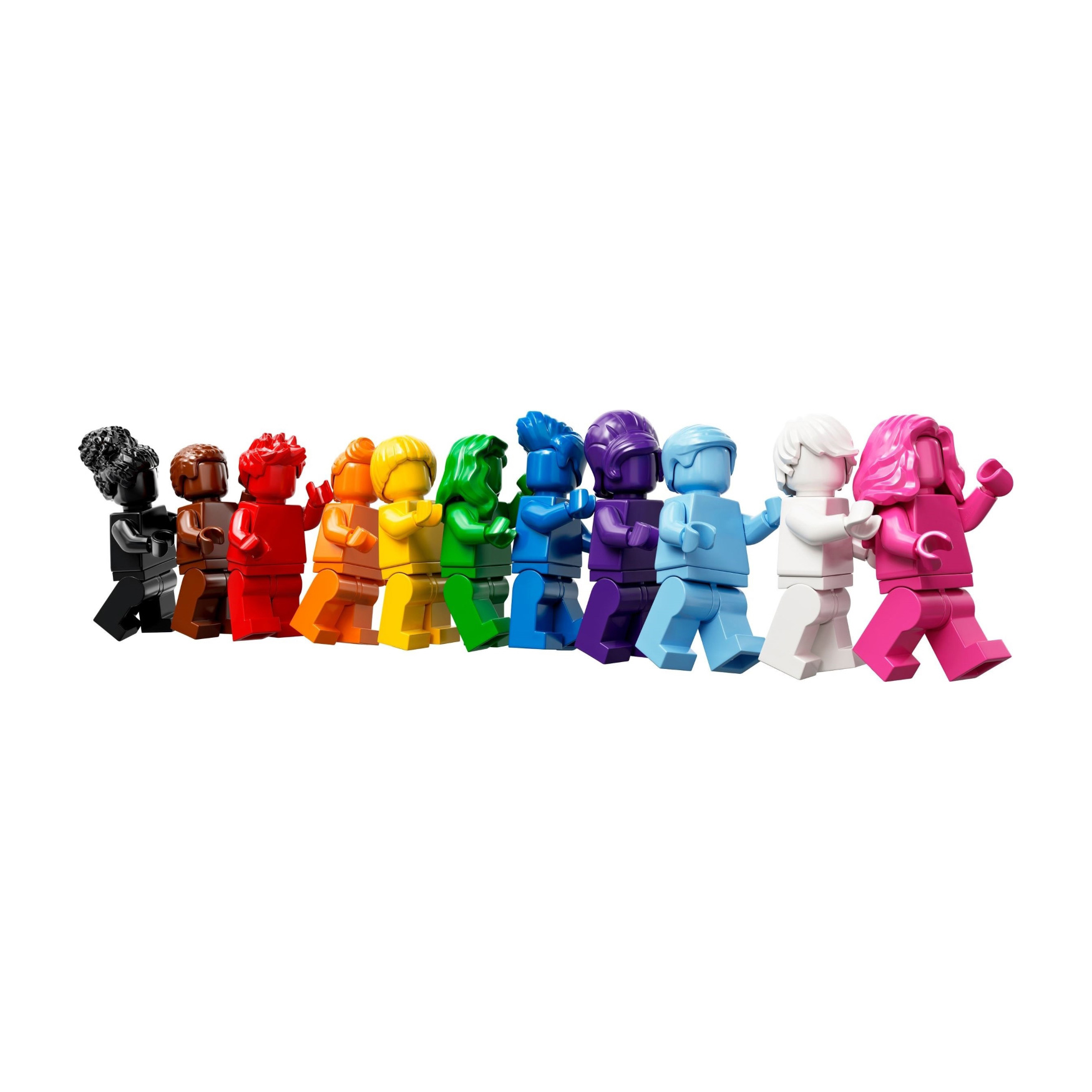 Build your very own homage to positivity and kindness with the LEGO® Everyone is Awesome building set. 11 monochrome minifigures stand against a rainbow background. Each minifigure not only has a different color, but also an individual hairstyle to represent the diversity of our community. Put out your model and show the world that despite all the differences, we celebrate love and togetherness together.