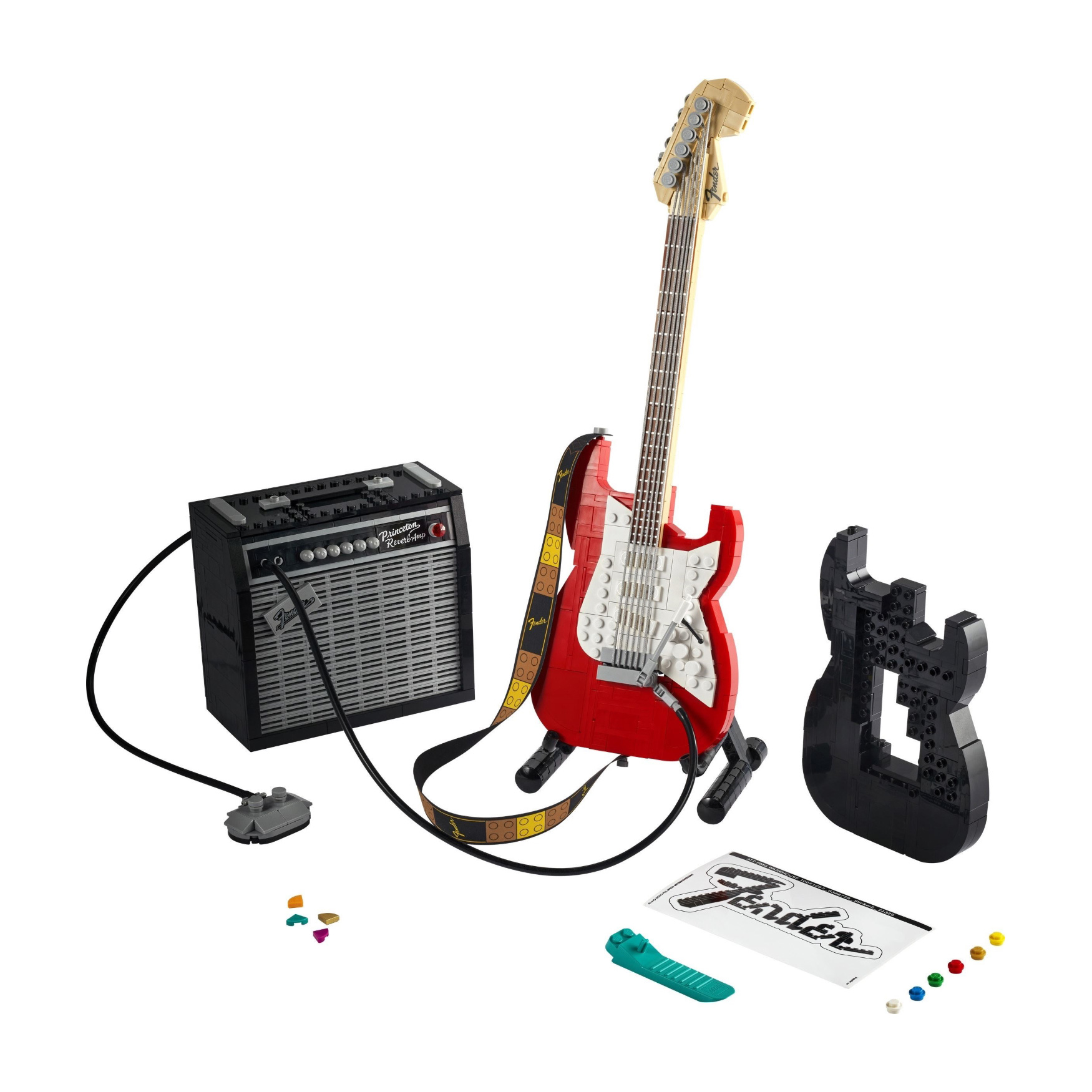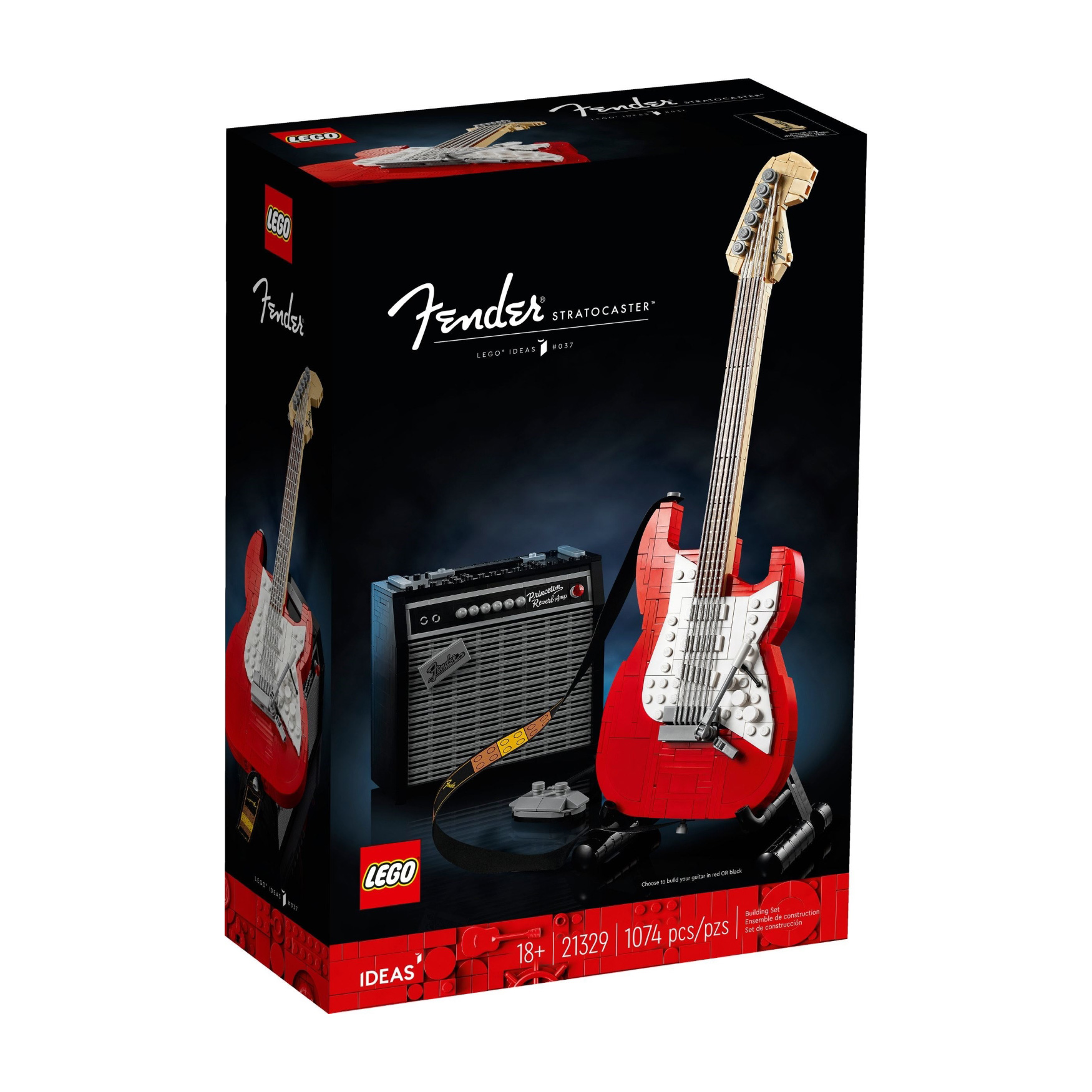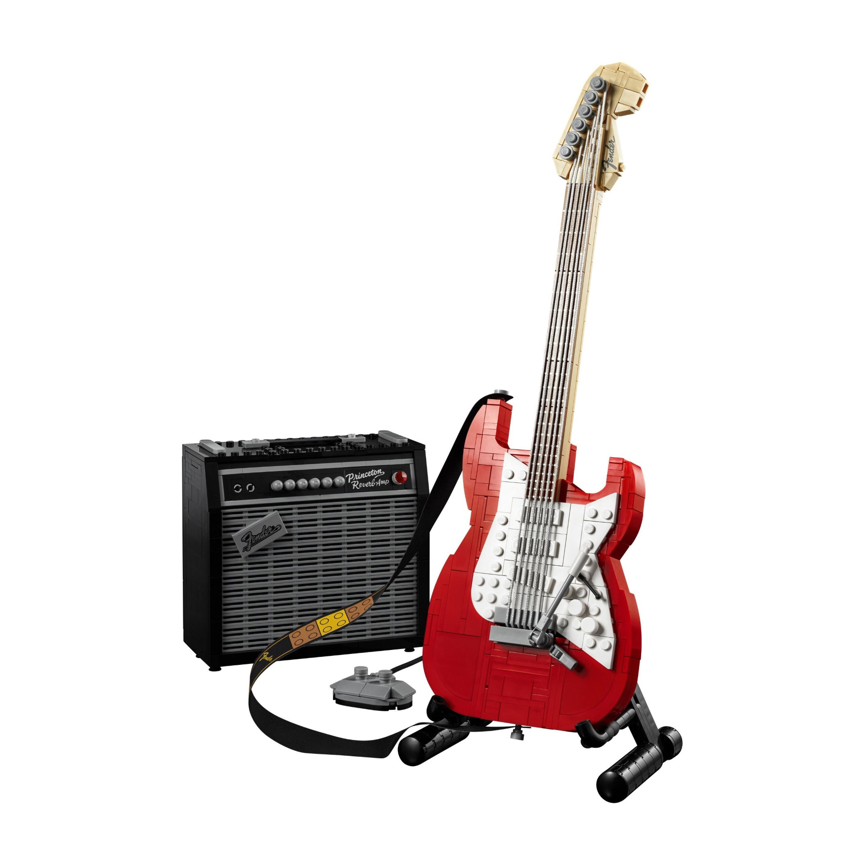 Build a 1970s Fender® Stratocaster™ and a 65 Princeton® Reverb with this LEGO® Ideas set (21329). Remember legendary musicians who played on a Stratocaster® as you recreate the legendary curves and add authentic details like the movable tremolo lever, pickup switch, and mechanics. Removable side walls provide a view of the tubes, the reverb spiral, the loudspeaker and other details in the amplifier. Rubber cables connect the amplifier to the guitar and foot switch.