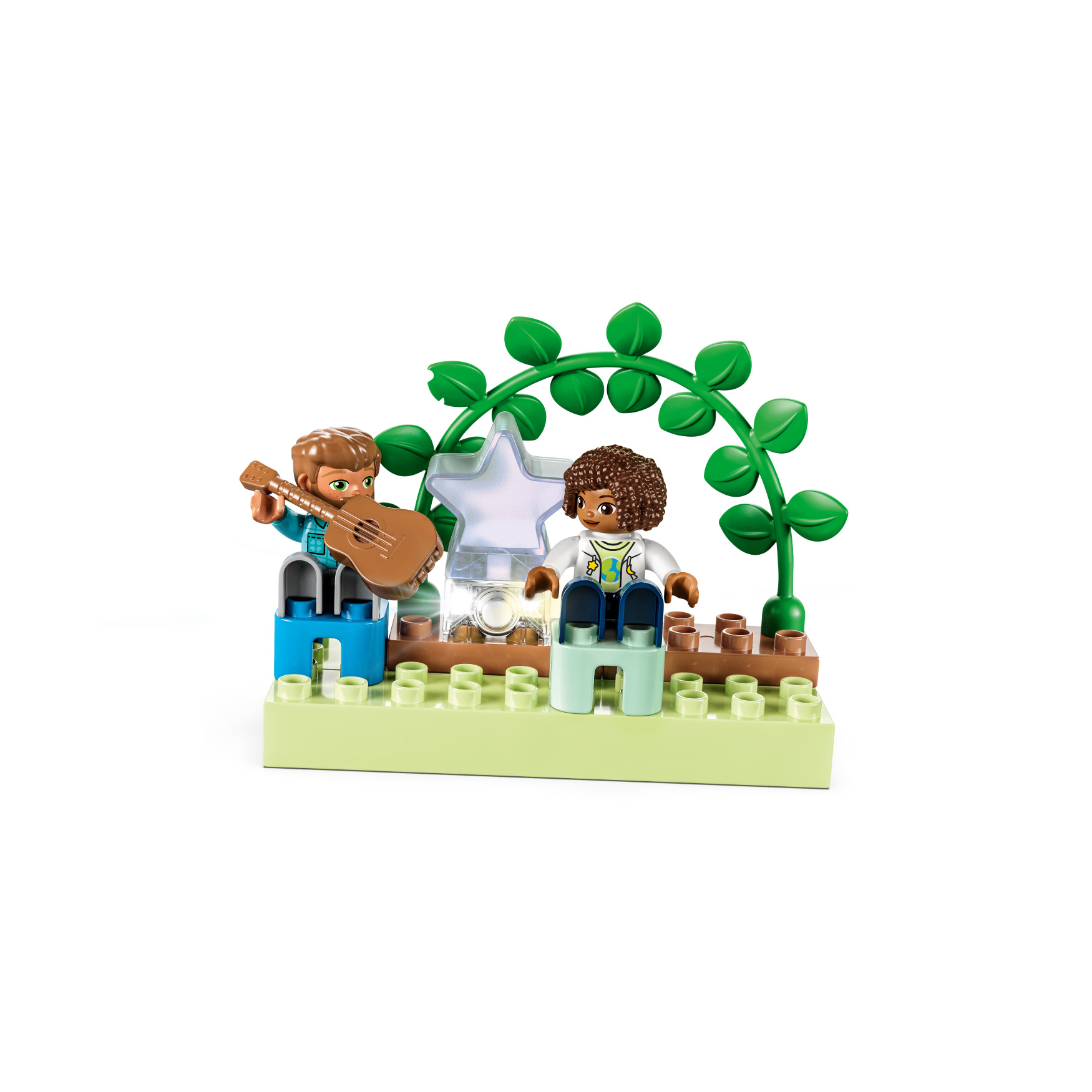 There’s a huge diversity of early learning opportunities packed into this toy house. Toddlers play out bedtime routines, including toothbrushing and story time tucked up in the toy bunk bed, where they can create a cozy mood using the light brick in the star lamp. They learn about healthy food in the kitchen or by picking the toy tomatoes and carrots in the garden. Inside the garage there’s a buildable electric toy car ‘charged’ by solar panels that has a fun push-and-go function for action play.