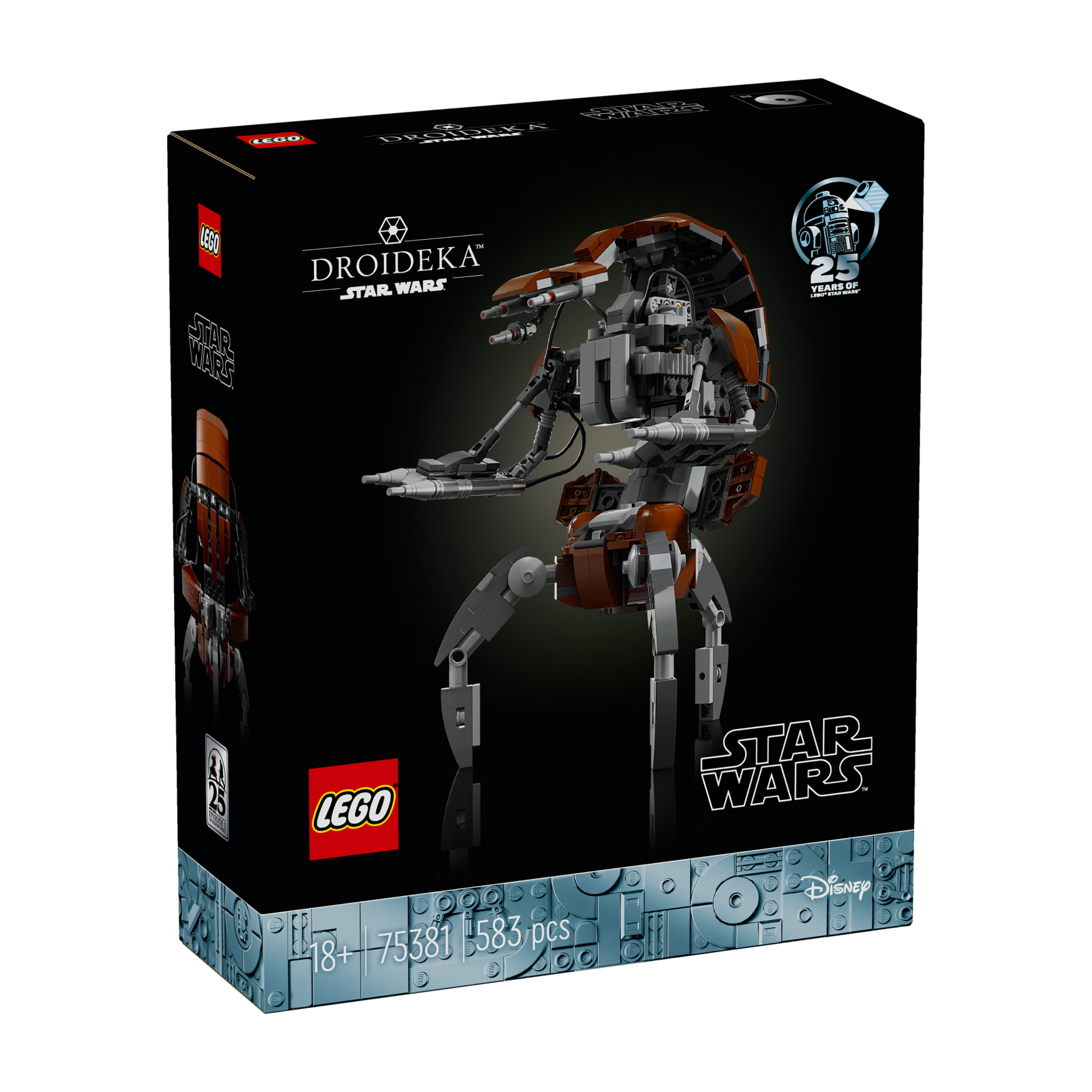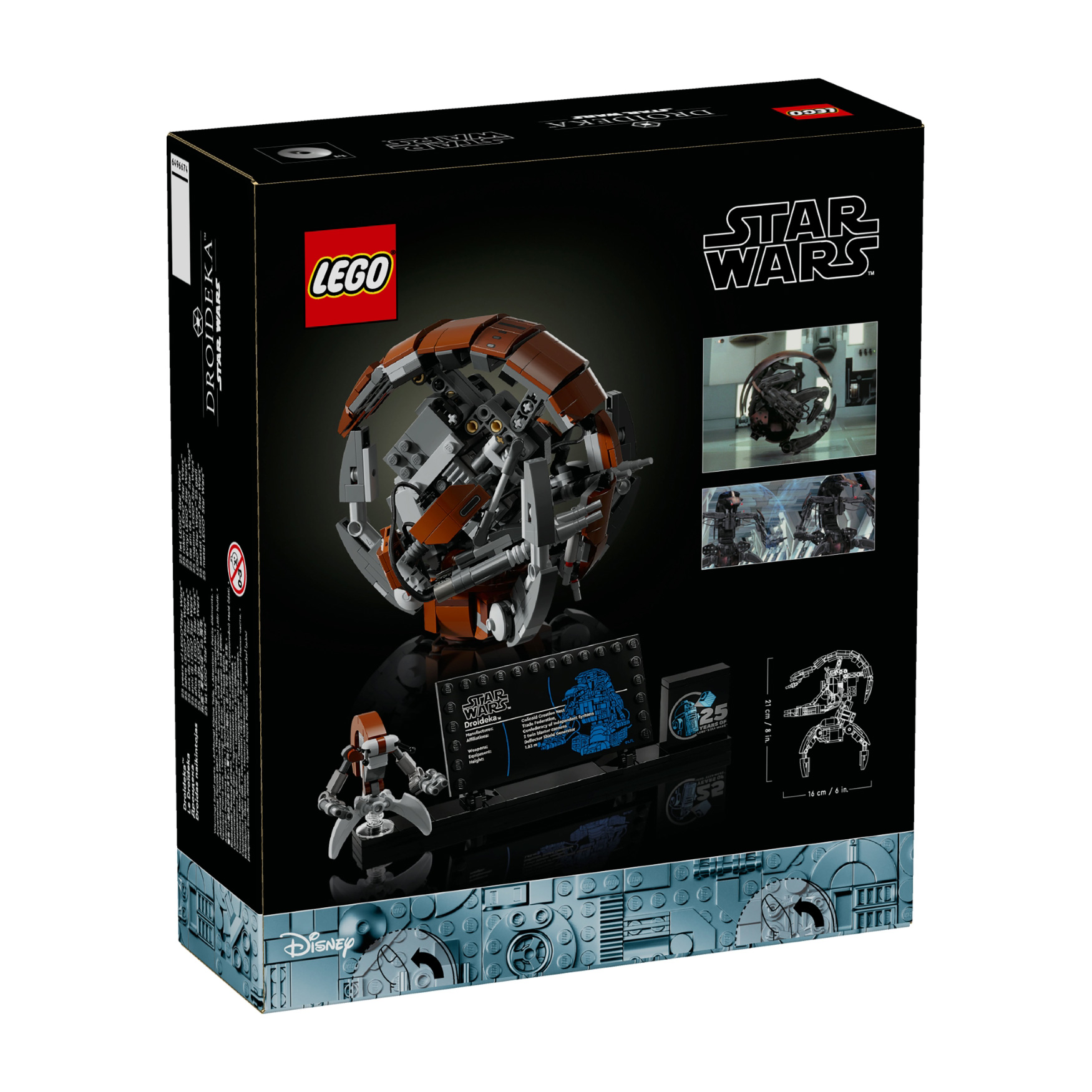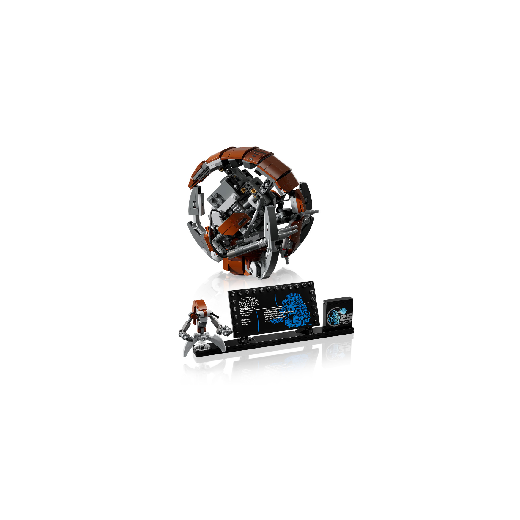 25th anniversary centerpiece – This unique set includes a stand with space for the small LEGO® droid figure of a Droideka, a Droideka information plaque and a LEGO Star Wars™ 25th anniversary brick