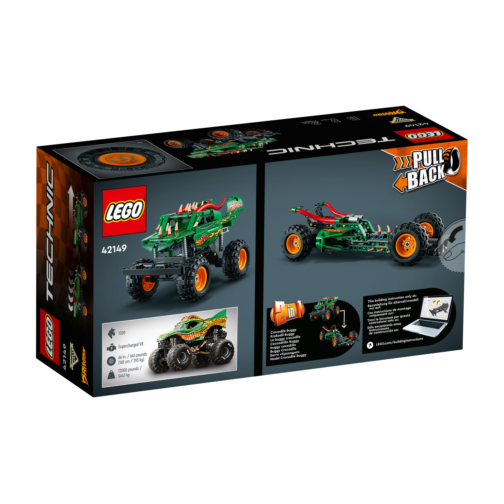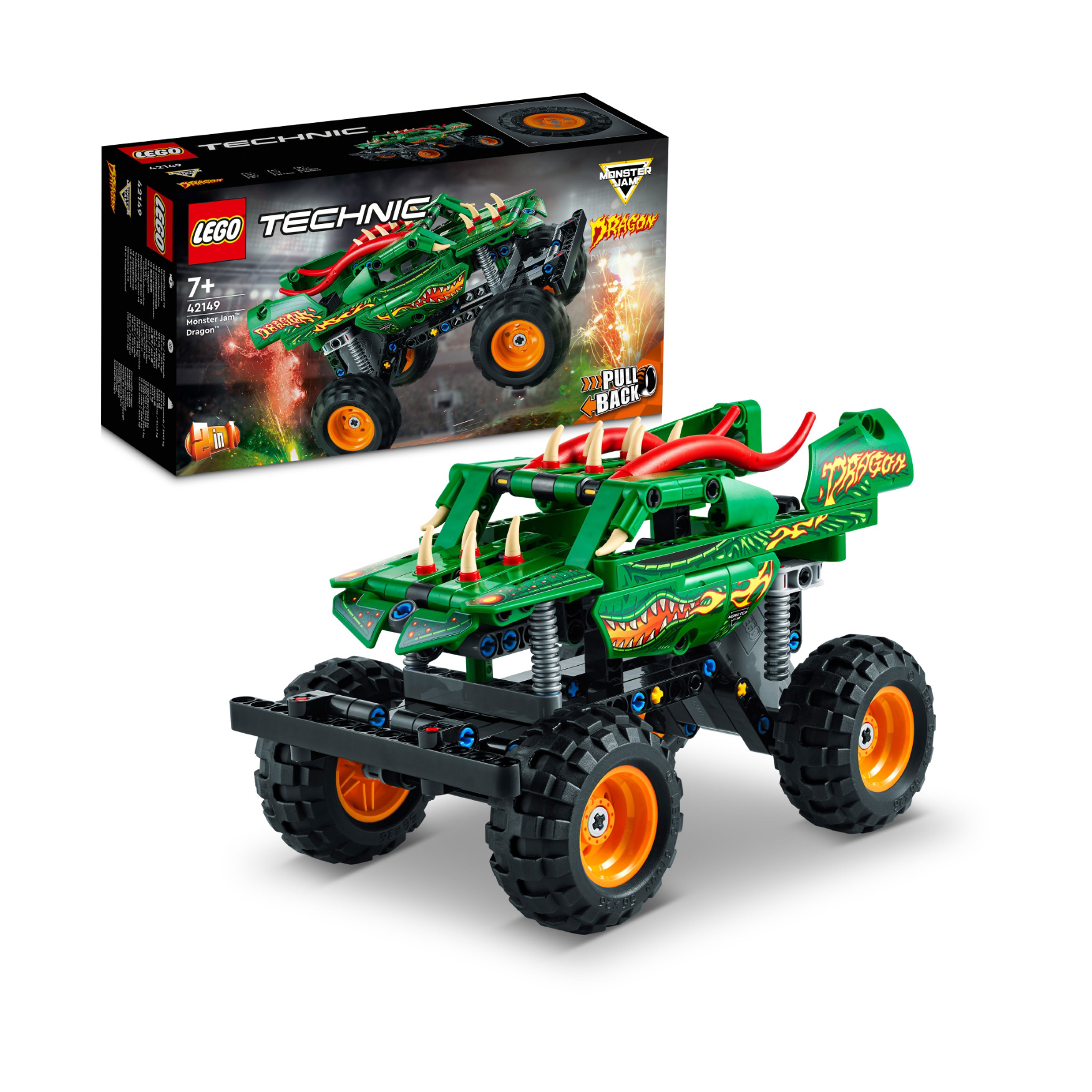 Kids aged 7+ who love Monster Jam™ have lots to discover with this LEGO® Technic™ Monster Jam Dragon™ (42149) pull-back truck toy. It comes with awesome dragon details like spikes and horns. With realistic graphics and colors, this toy truck model lets kids recreate favorite scenes from the Monster Jam arena.