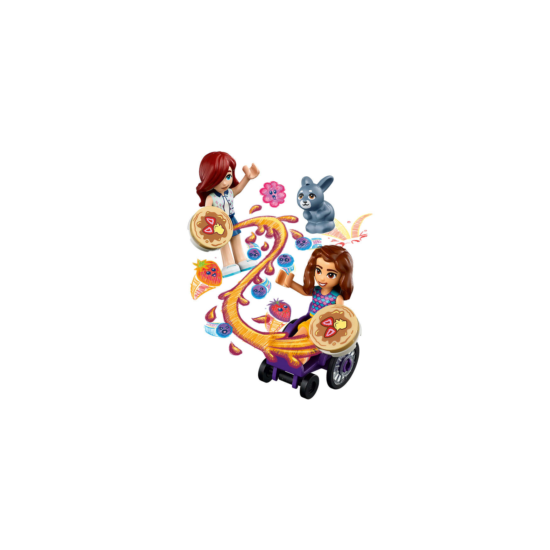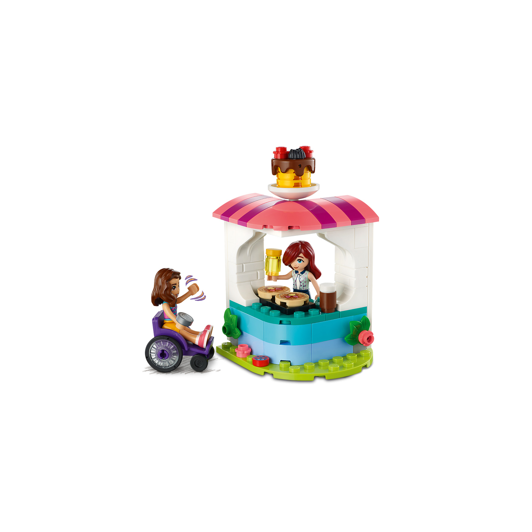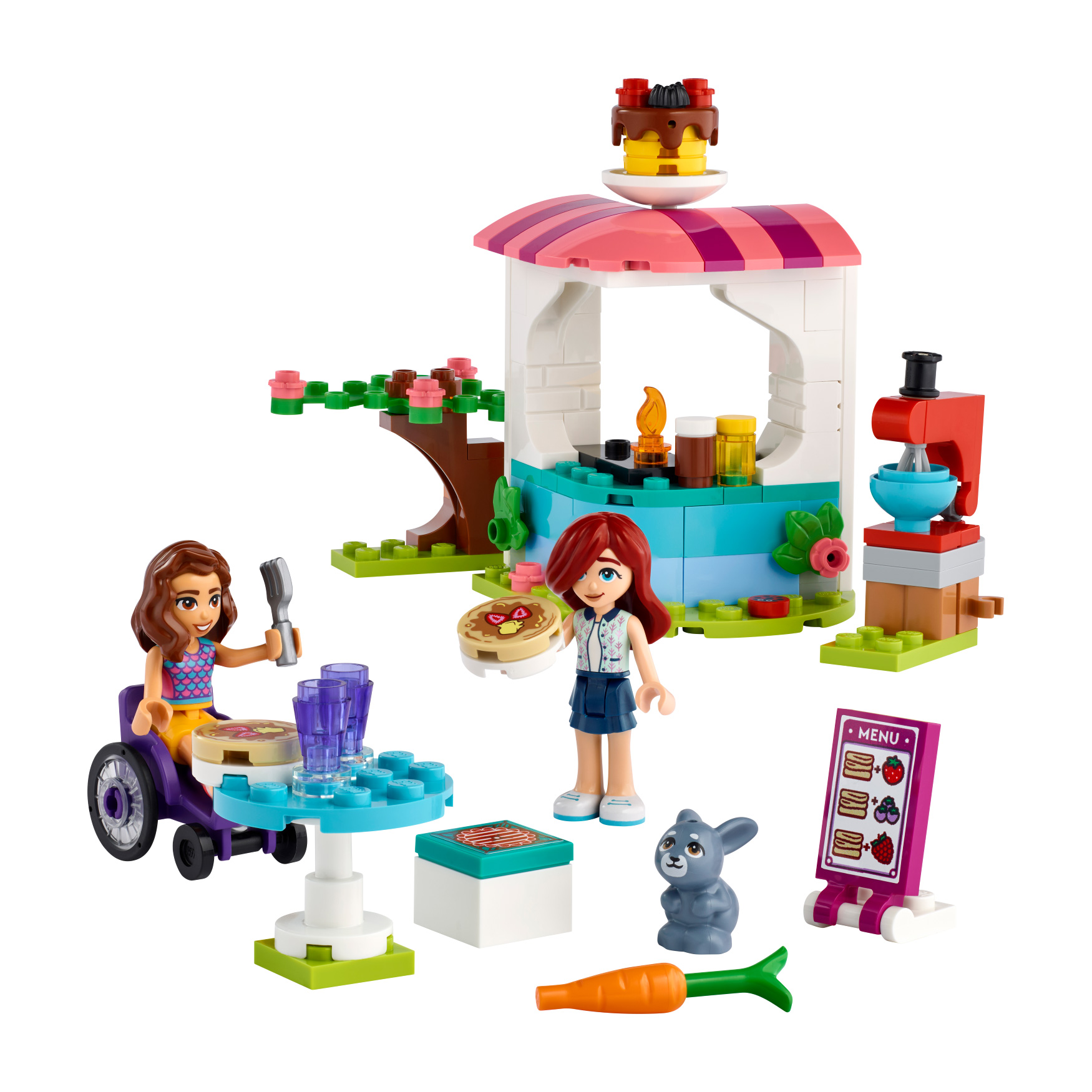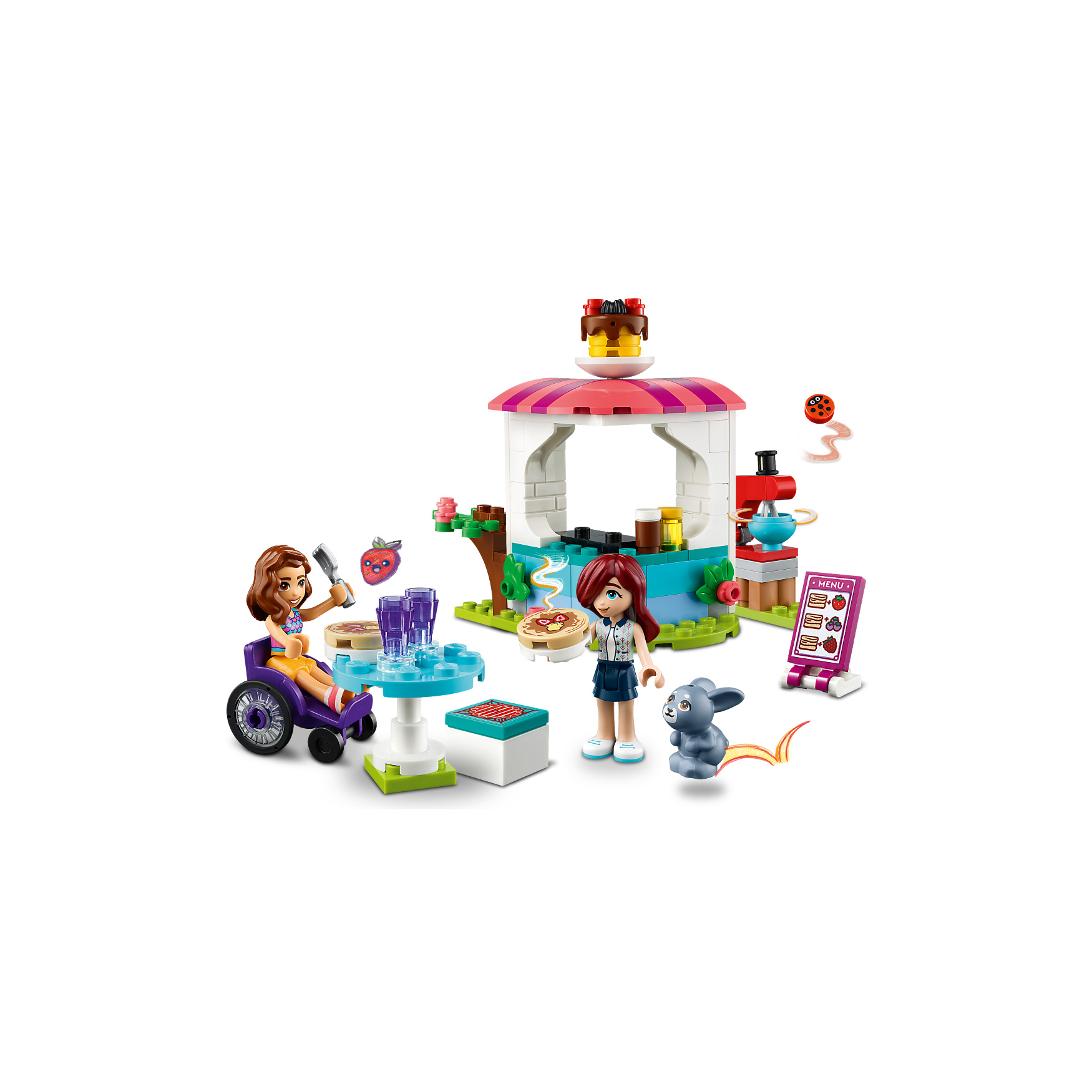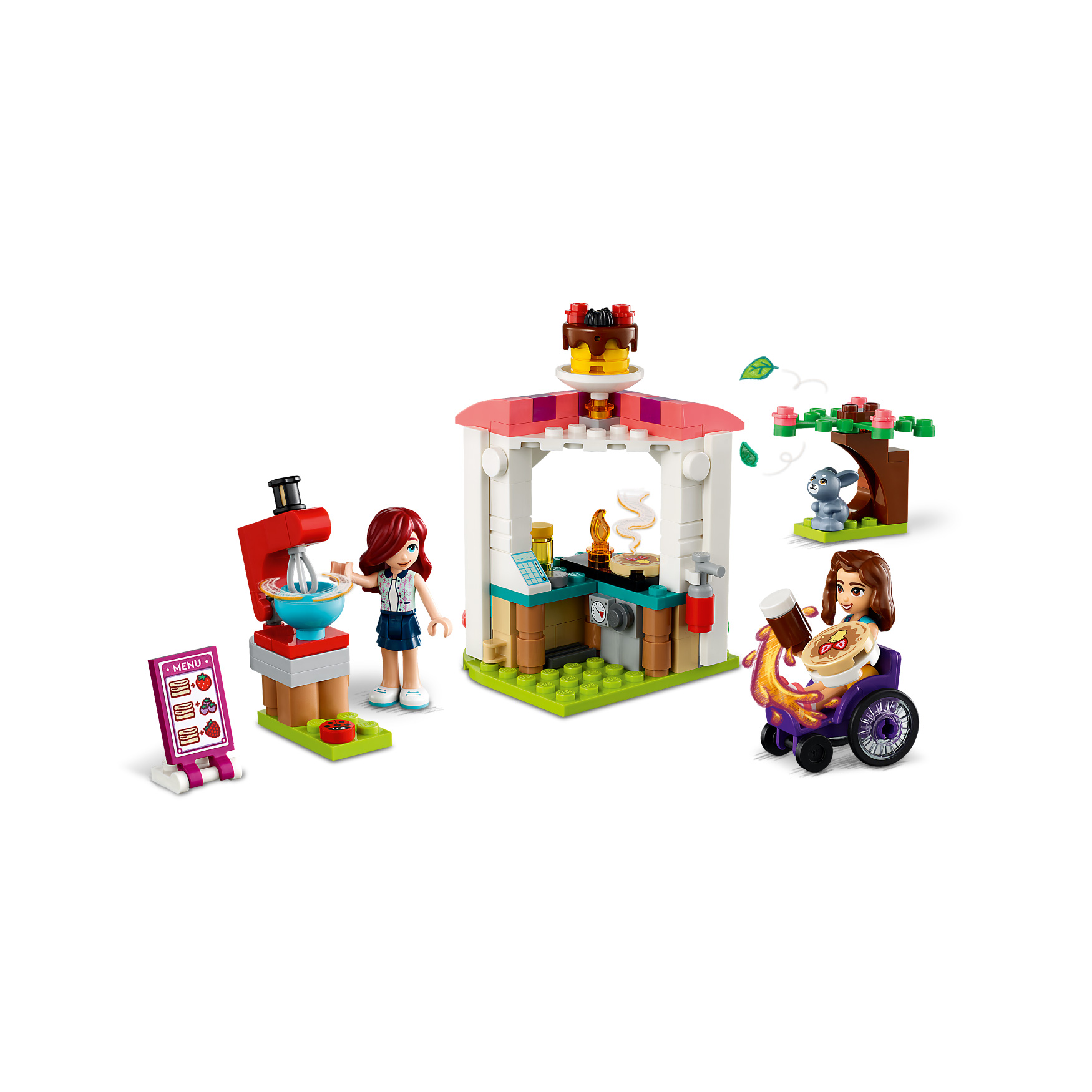 Pancake-making accessories – This LEGO® Friends set includes a menu card, 2 pancakes, chocolate and honey cans, 2 forks, 2 cups, a fire extinguisher and a mixer