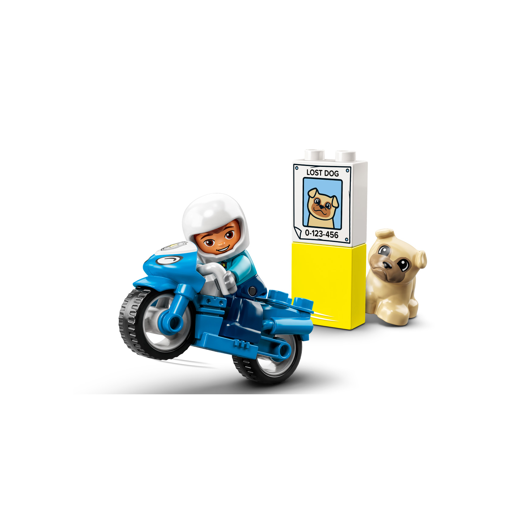 Inspires imaginative play – The set includes 2 LEGO® DUPLO® figures – a police officer and a cute dog – a ‘lost dog’ poster, plus a cool blue police motorcycle for the officer and dog to ride on