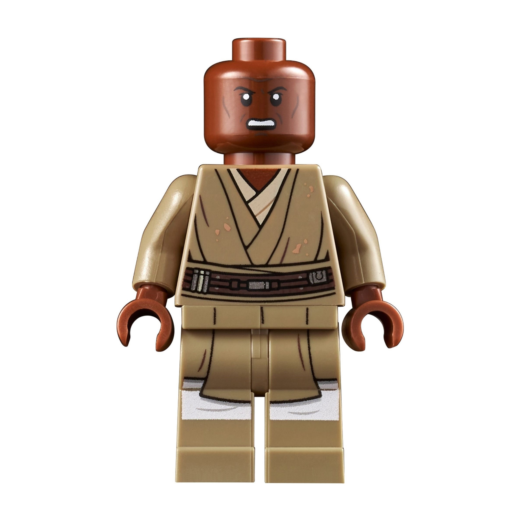 The display stand has an information plaque and spaces for 2 included LEGO® Star Wars™ minifigures: Clone Trooper Commander with a blaster and Mace Windu with a lightsaber.