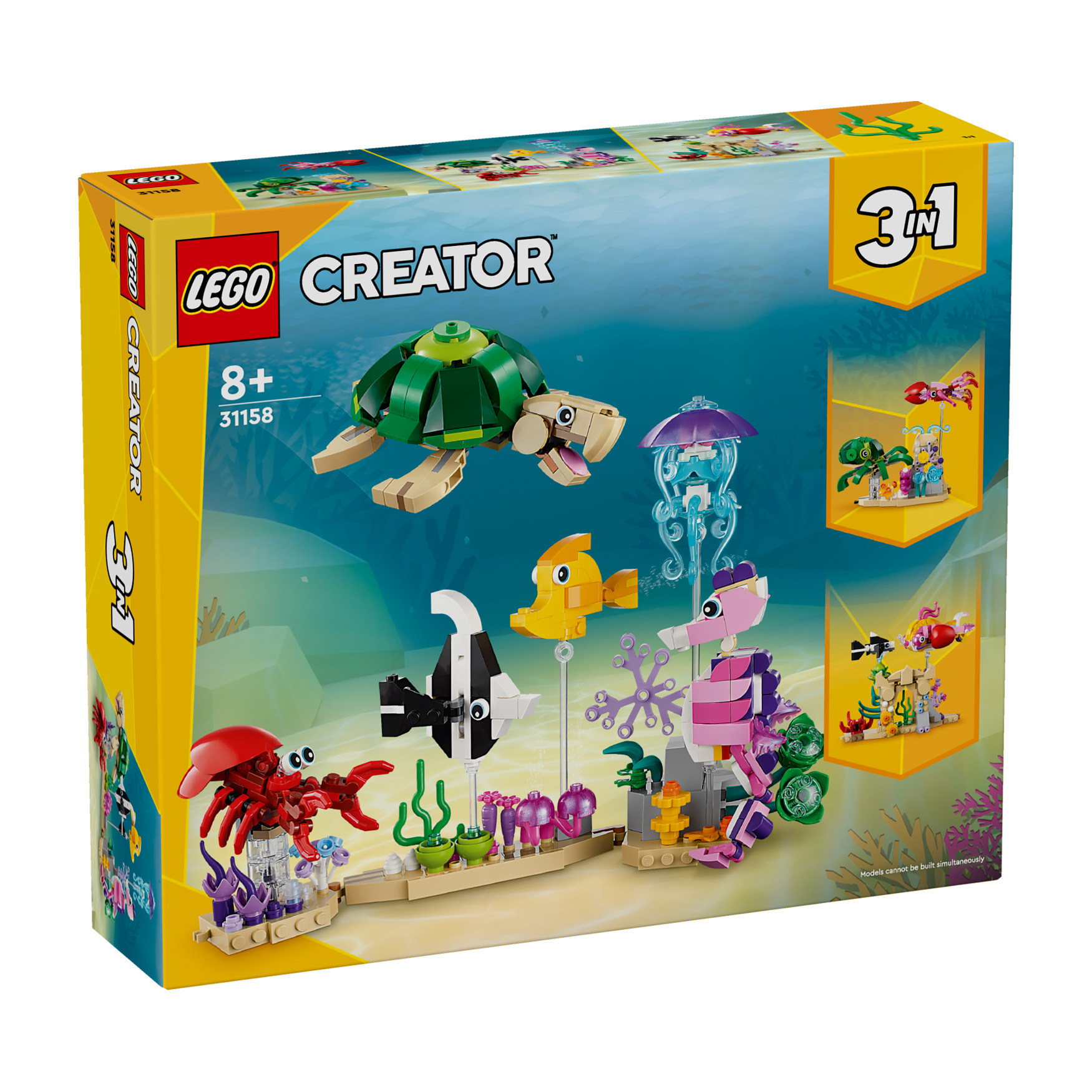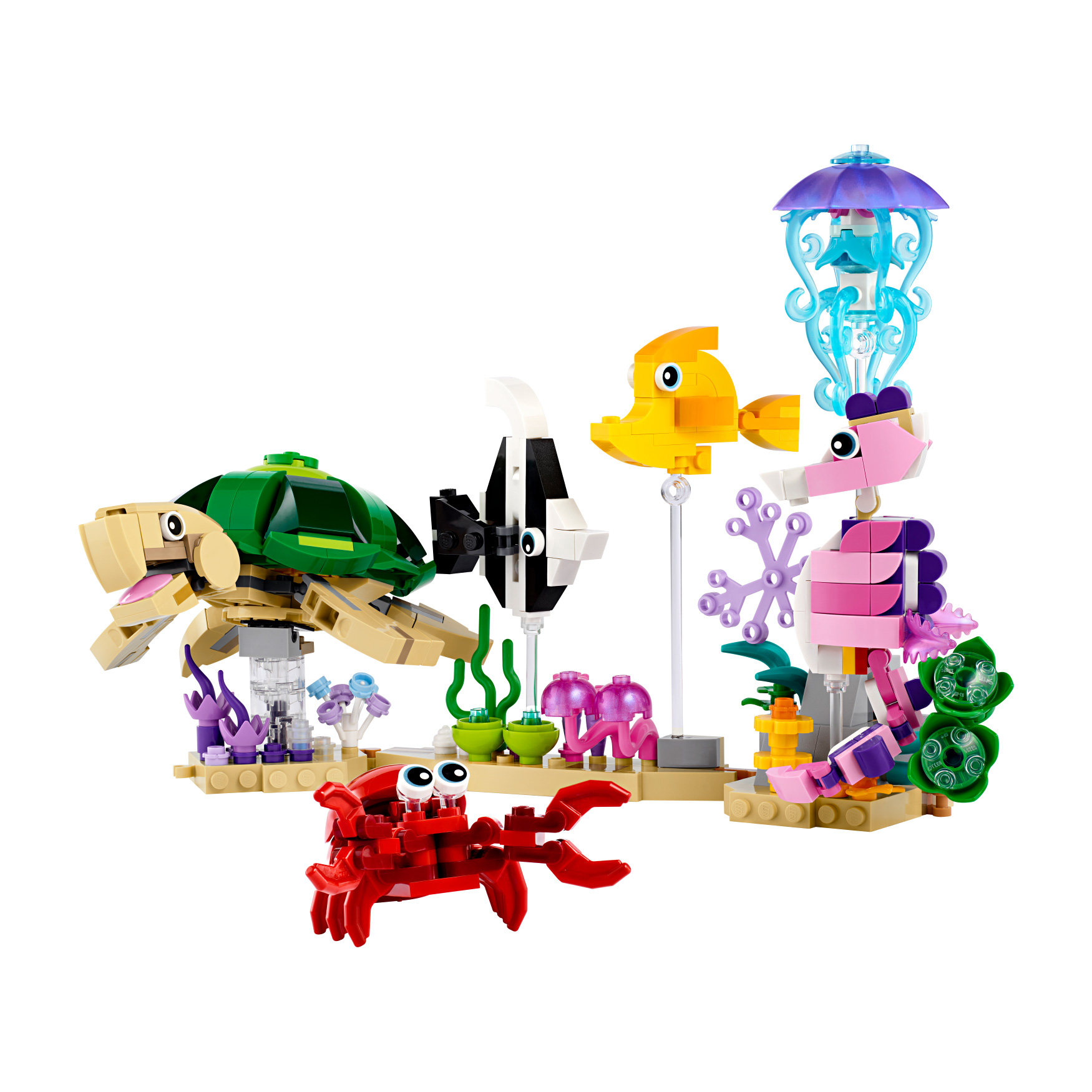Boys and girls aged 8+ can build, play with and display this colorful LEGO® Creator Sea Animals (31158) 3in1 building set. It features 2 fish, a turtle, a jellyfish and a seahorse toy displayed on transparent rods as part of a seafloor stand adorned with sea plants, plus a red crab figure. The sea creature toys can swap positions on the stand, which can be straightened or angled.