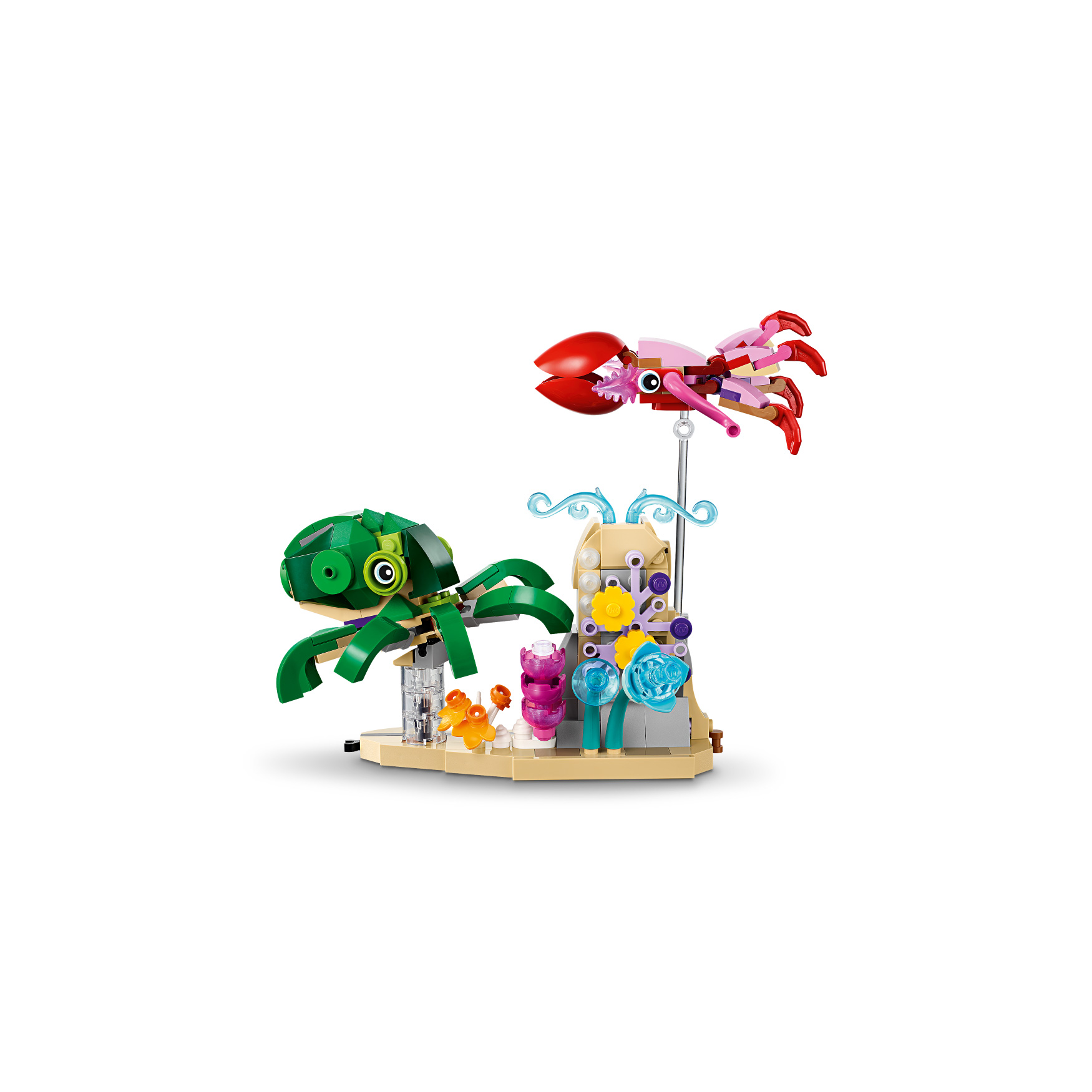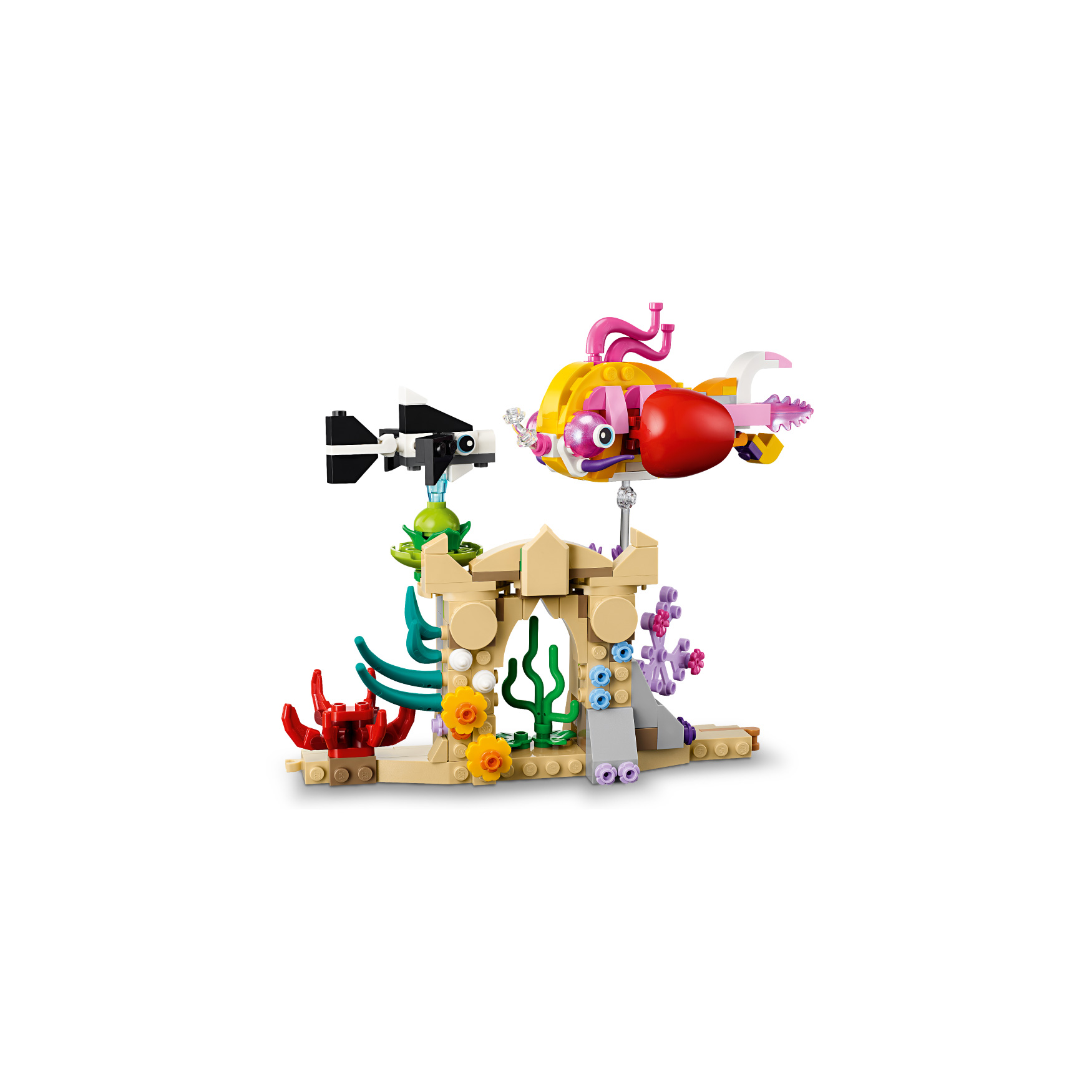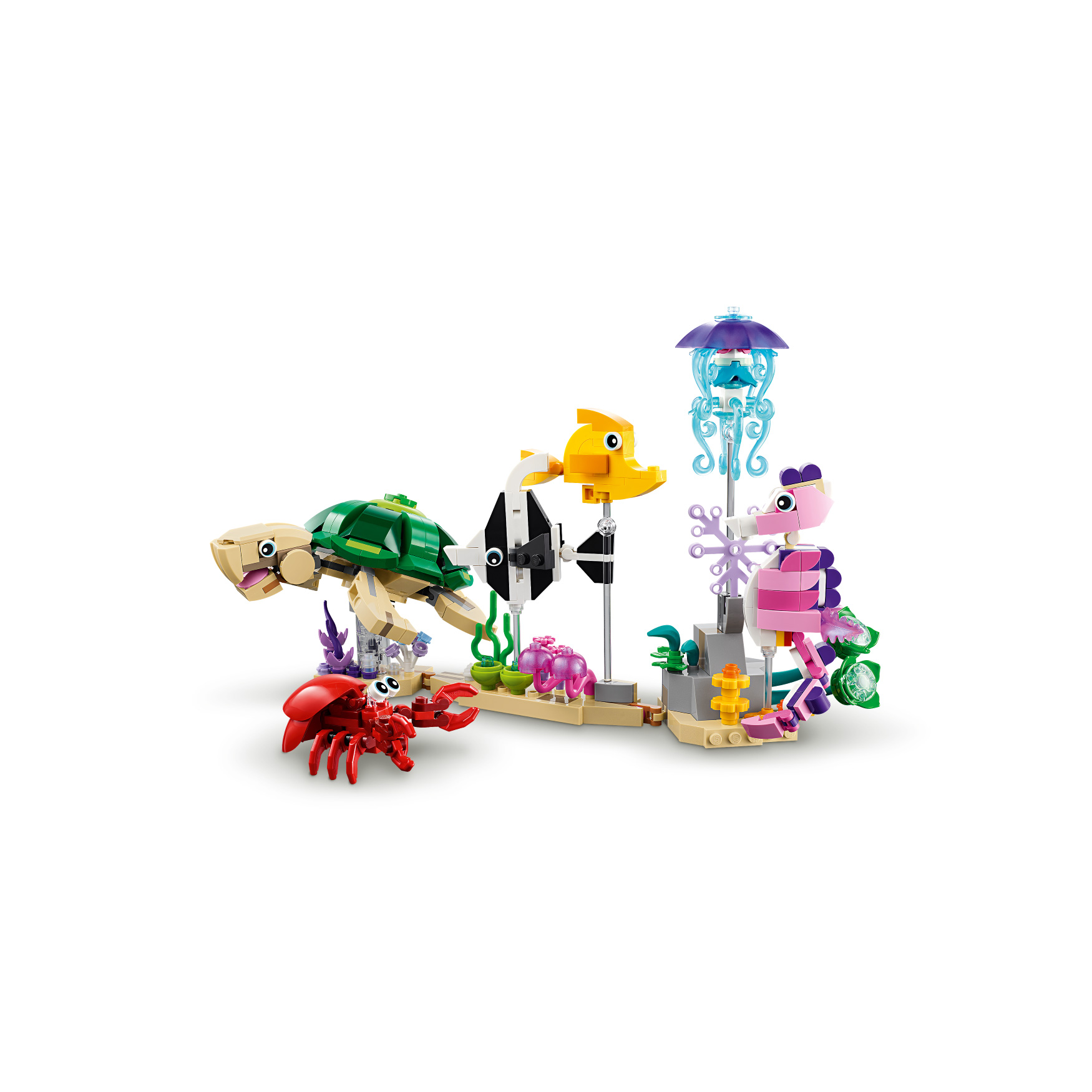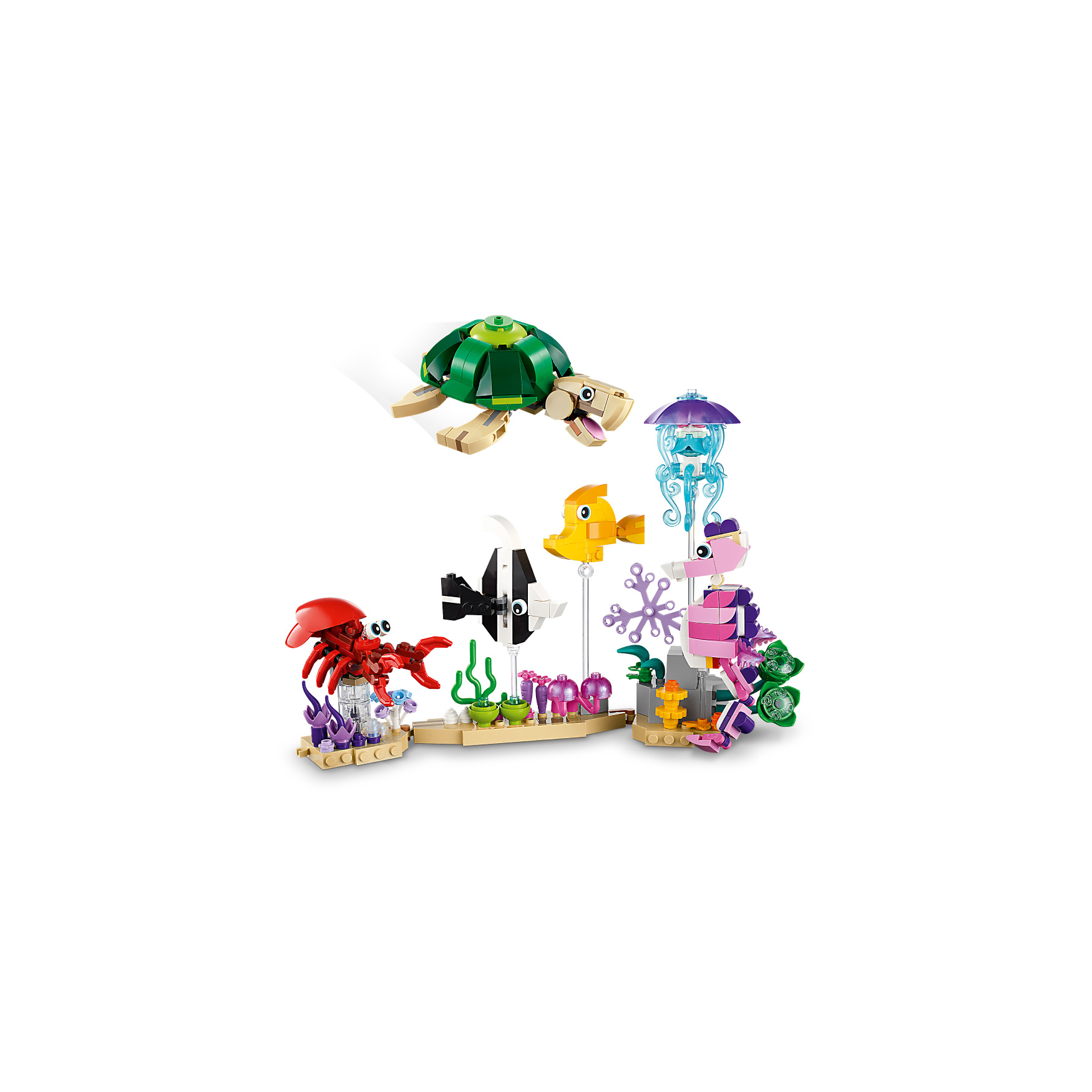 LEGO fans can choose from 3 different buildable underwater scenes with this 3in1 toy playset. They can build a collection of 6 sea animals with a seafloor stand, rebuild it into an octopus and squid next to a bubbling piece of volcanic rock, or 2 fish gliding around colorful sea plants.