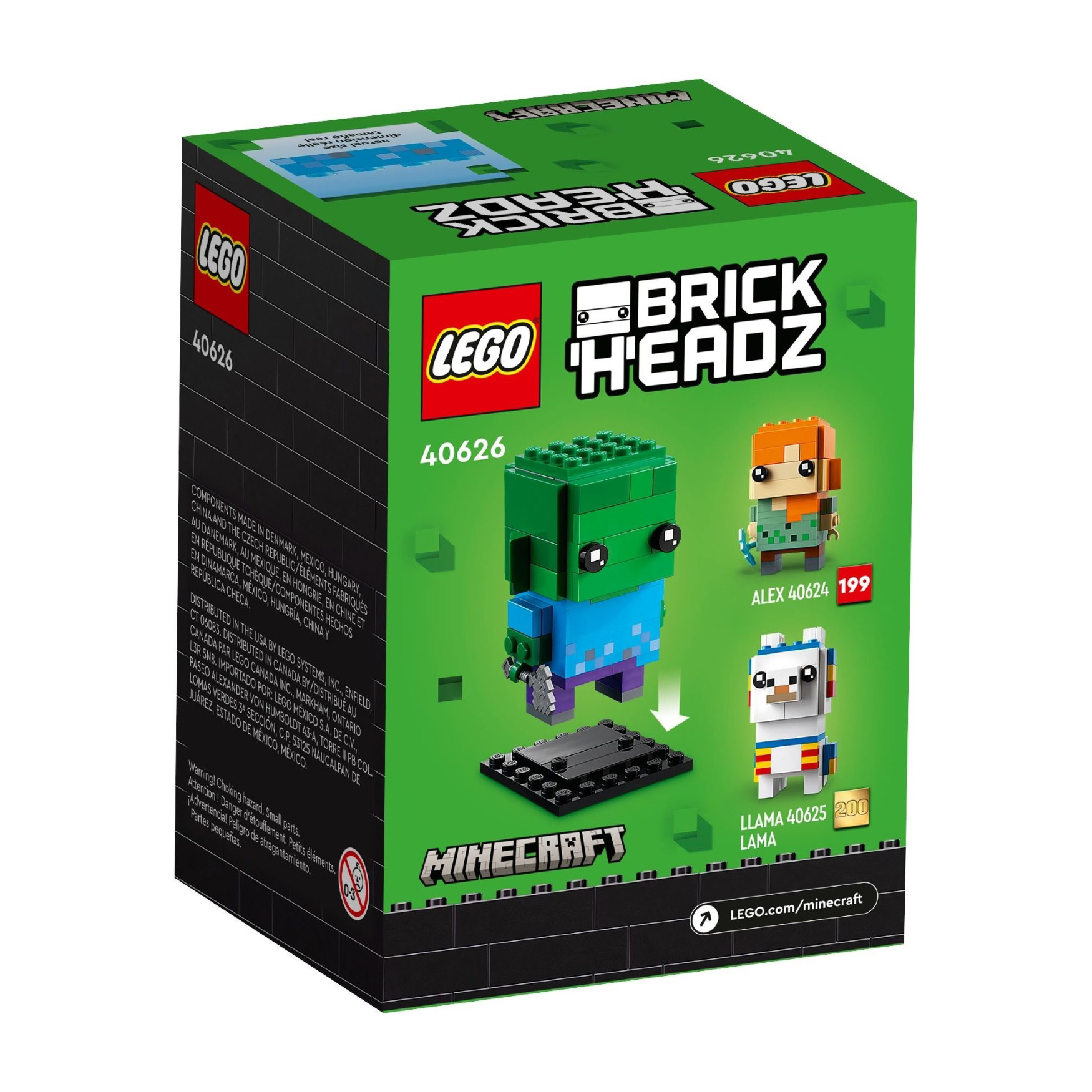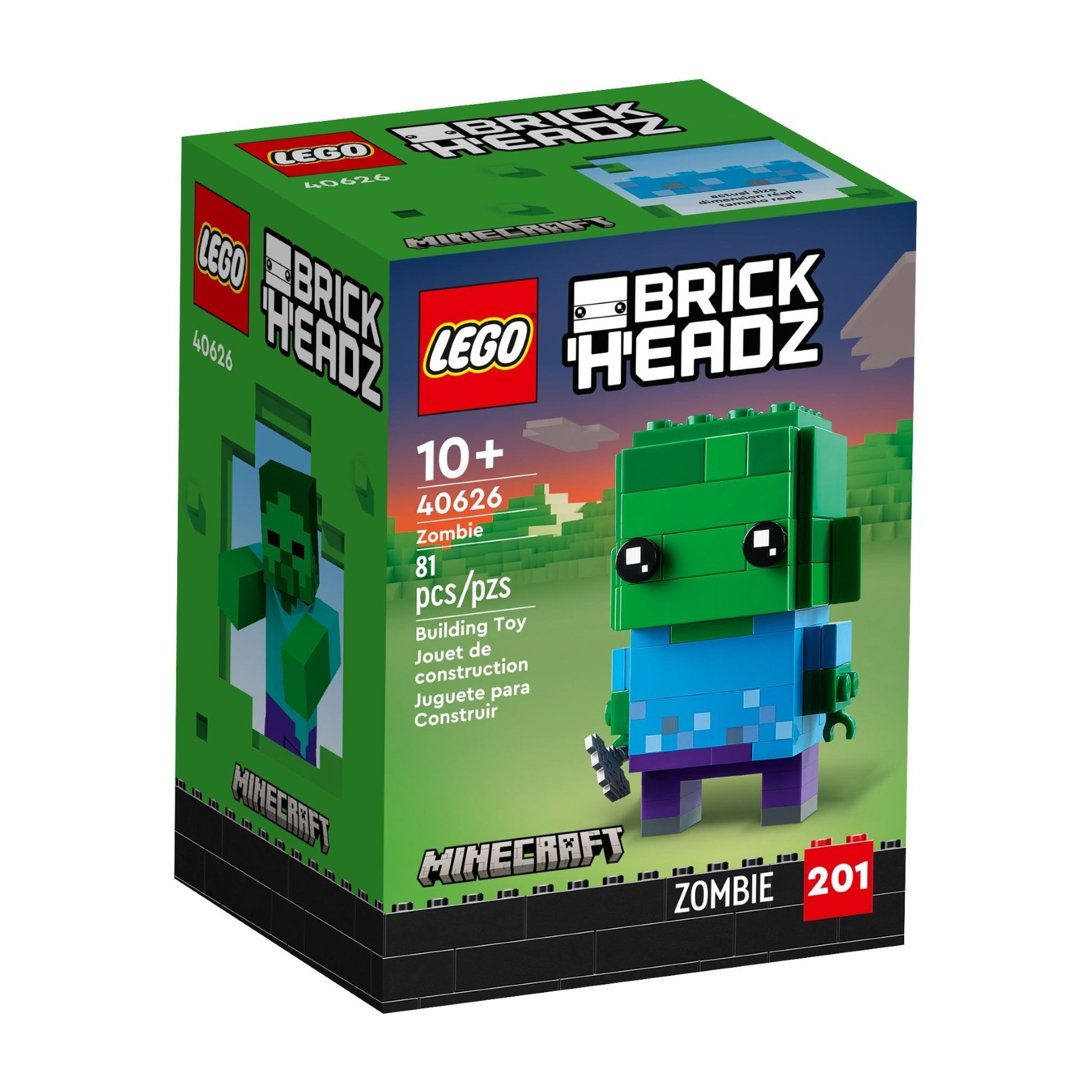 Zombies are the iconic hostile mobs from the Minecraft® video game. And now, Minecraft players aged 10 and up can build their own LEGO® BrickHeadz™ Zombie (40626). The authentically detailed figure stands over 3 in. (8 cm) tall and features a baseplate stand, making it perfect for hands-on play as well as putting on show for all to admire.