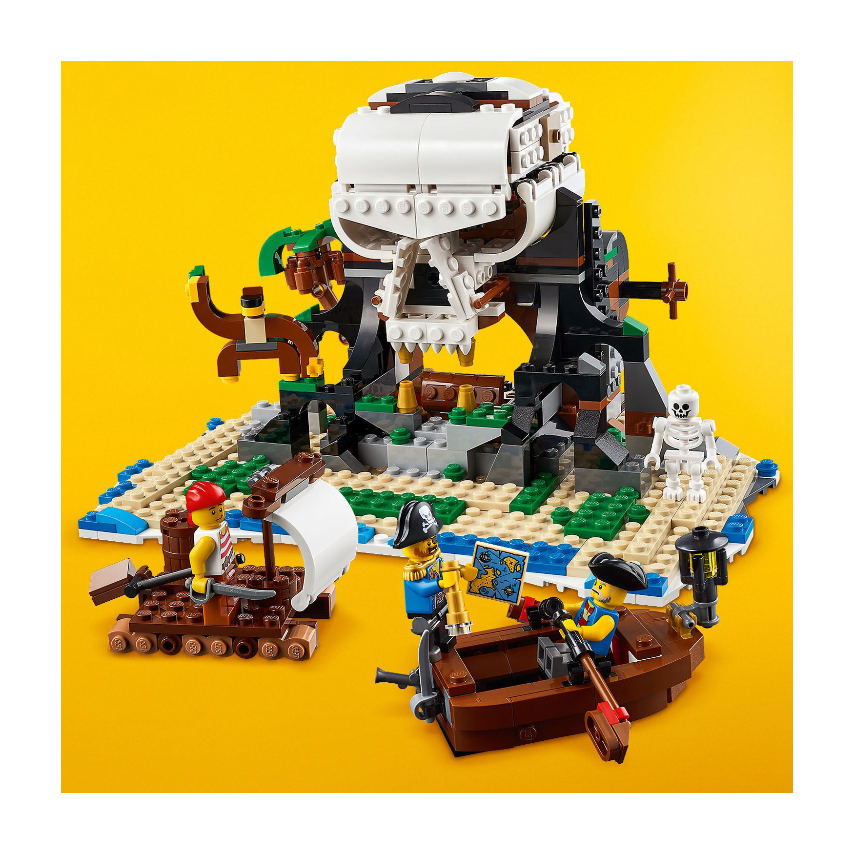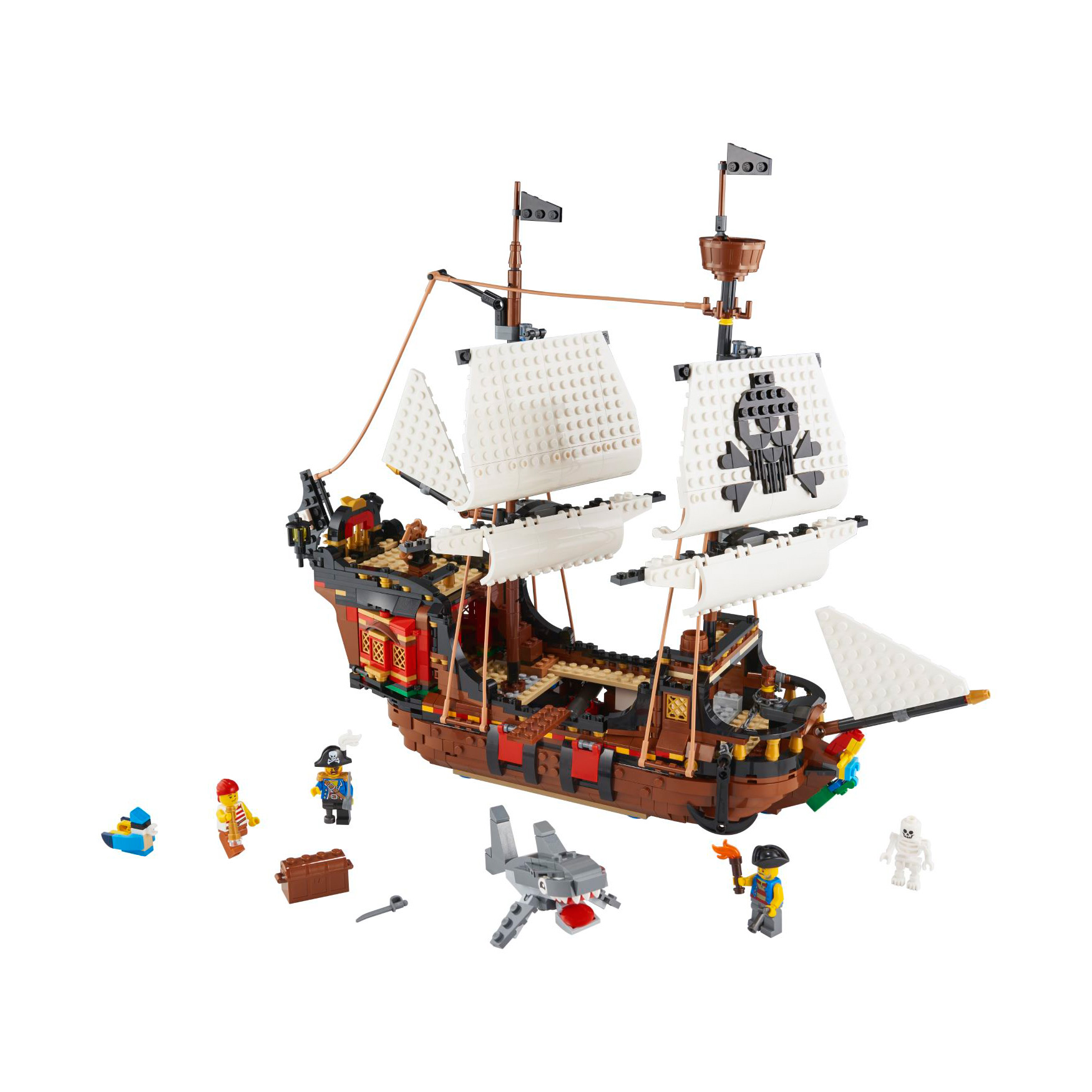 Ahoy! Set sail and drop anchor to set sail with the fantastic pirate ship! Keep an eye out for loot – the cargo hold looks pretty empty. Ahoy, ship ahead on starboard! Put the cannons in position and make them ready for fire: this ship looks like rich prey! After this adventure, you will rebuild the ship into the pirate tavern or the mysterious pirate island. This great 3-in-1 set knows no lull!